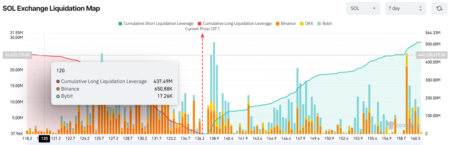 Solana (SOL) के लिए 7-दिन का लिक्विडेशन हीटमैप दर्शाता है कि अगर SOL $120 तक गिरता है, तो लॉन्ग लिक्विडेशन $437 मिलियन से अधिक हो सकता है। यह इसकी वर्तमान कीमत $136.3 से अतिरिक्त 11% गिरावट को दर्शाएगा।