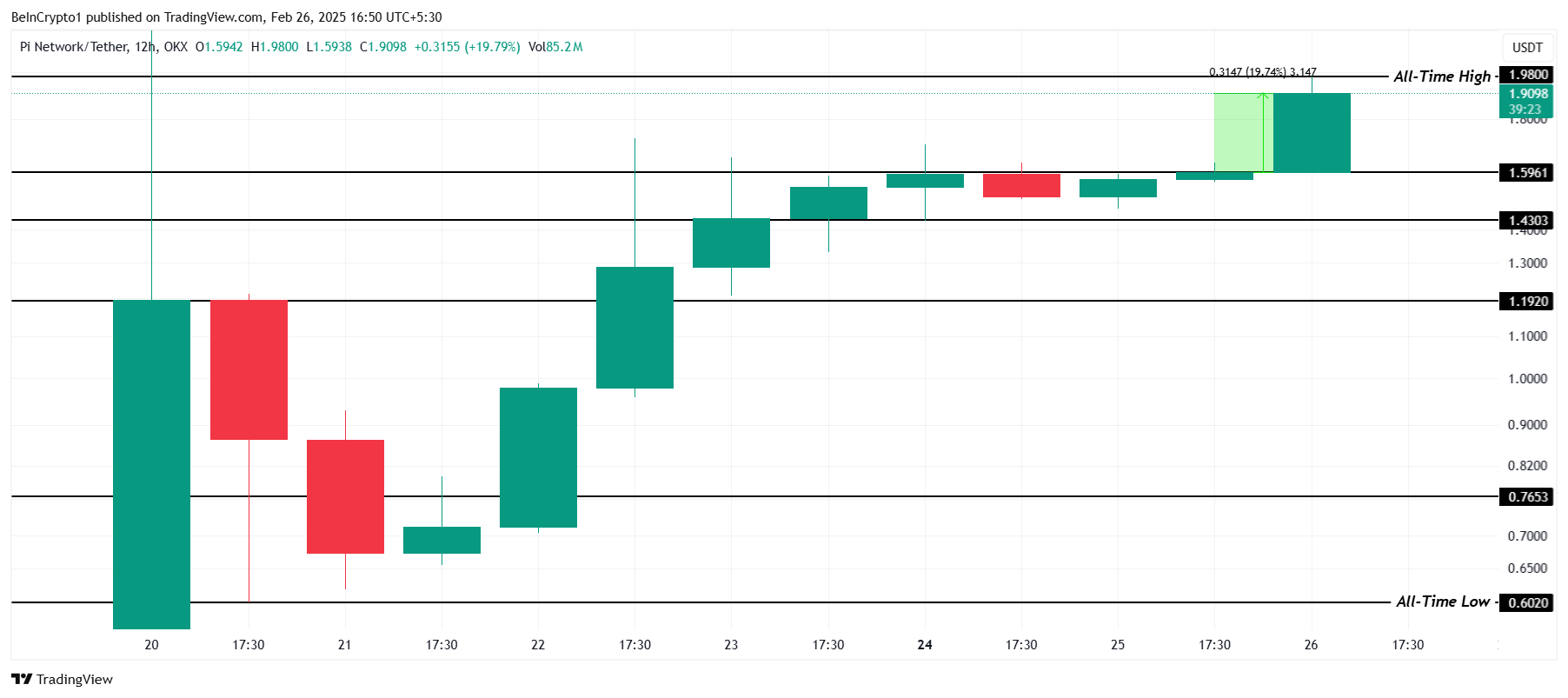 Pi Network की कीमत पिछले 24 घंटों में 19% बढ़ी, एक इंट्रा-डे रैली के दौरान $1.98 के ऑल-टाइम हाई तक पहुंच गई। हालांकि, यह थोड़ी गिर गई है और वर्तमान में $1.90 पर ट्रेड कर रही है। यह प्राइस मूवमेंट Pi की अस्थिरता को बाजार के उतार-चढ़ाव और निवेशक रुचि के बीच दर्शाता है।