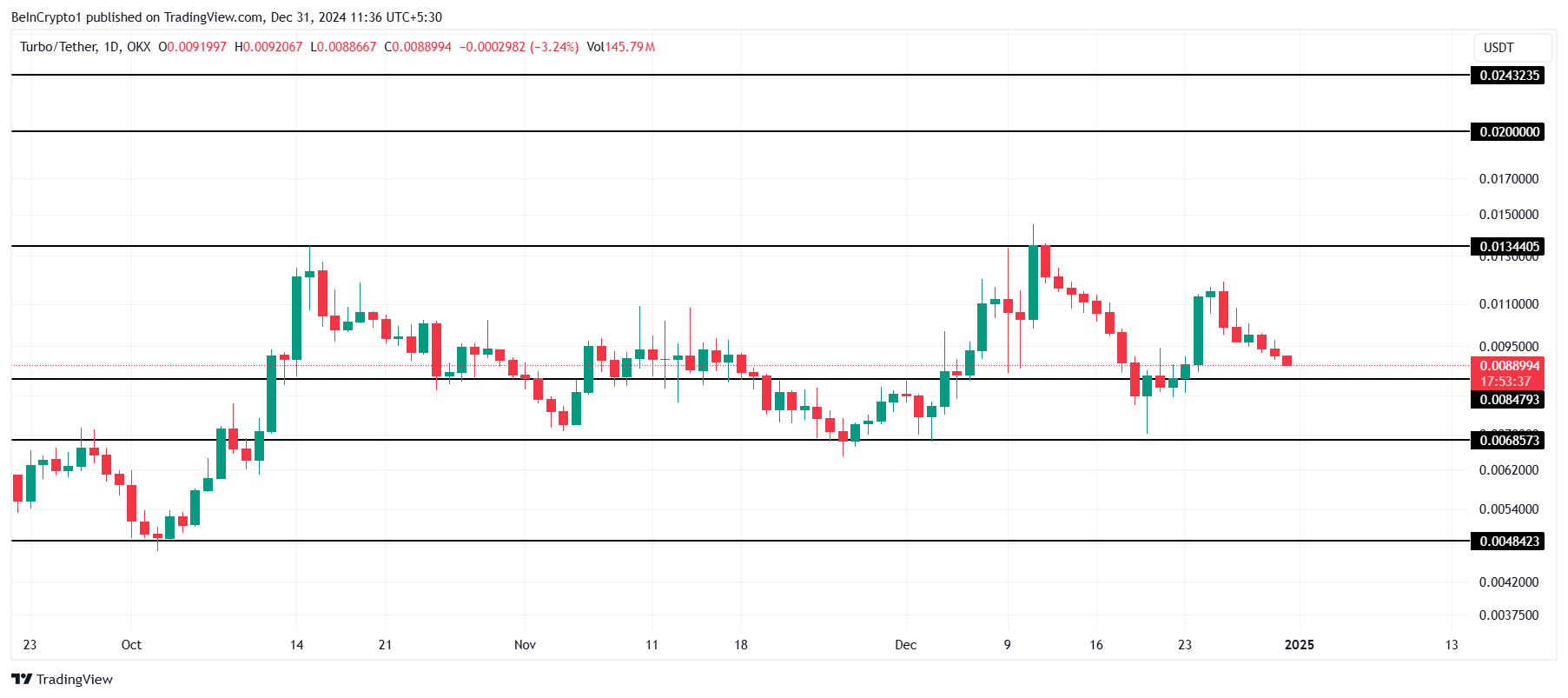 हालांकि, अगर Turbo की कीमत $0.008 से नीचे फिसलती है, तो यह $0.006 के महत्वपूर्ण सपोर्ट लेवल का परीक्षण करने का जोखिम उठाती है। इस बिंदु से आगे की कोई भी गिरावट बुलिश दृष्टिकोण को अमान्य कर देगी, जिससे निवेशकों के विश्वास के स्थायित्व को लेकर चिंताएं बढ़ेंगी। डाउनवर्ड प्रेशर को रोकने के लिए स्थिरता बनाए रखना महत्वपूर्ण है।
