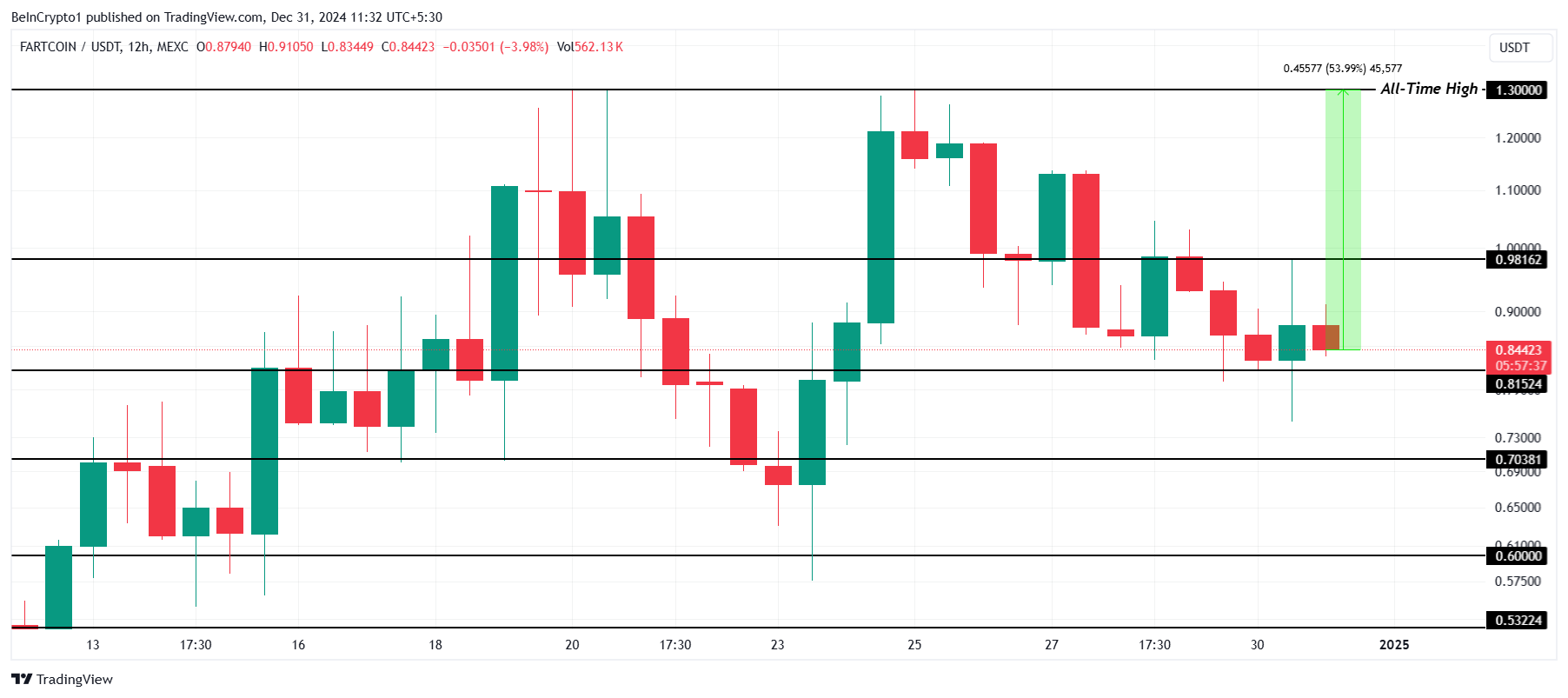 वर्तमान में $0.98 से नीचे ट्रेड कर रहा है, FARTCOIN अपने ऑल-टाइम हाई से 54% दूर है लेकिन $0.81 सपोर्ट लेवल से ऊपर है। यह मजबूती इसके मार्केट ट्रेंड्स का लाभ उठाने की क्षमता को दर्शाती है।