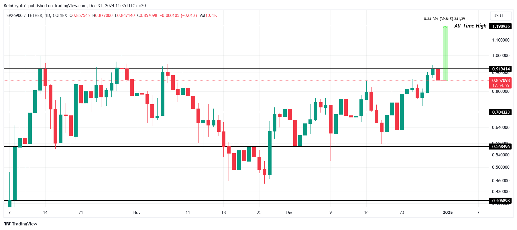 SPX $0.85 पर ट्रेड कर रहा है, $1.19 से परे एक नया ATH बनाने का लक्ष्य रखते हुए, जो 40% की वृद्धि की आवश्यकता होगी लेकिन $0.91 रेजिस्टेंस के तहत सीमित है। मीम कॉइन को मध्य-अक्टूबर से लगातार चुनौतियों का सामना करना पड़ा है, जो बाजार की हिचकिचाहट और सीमित अपवर्ड मूवमेंट को दर्शाता है।