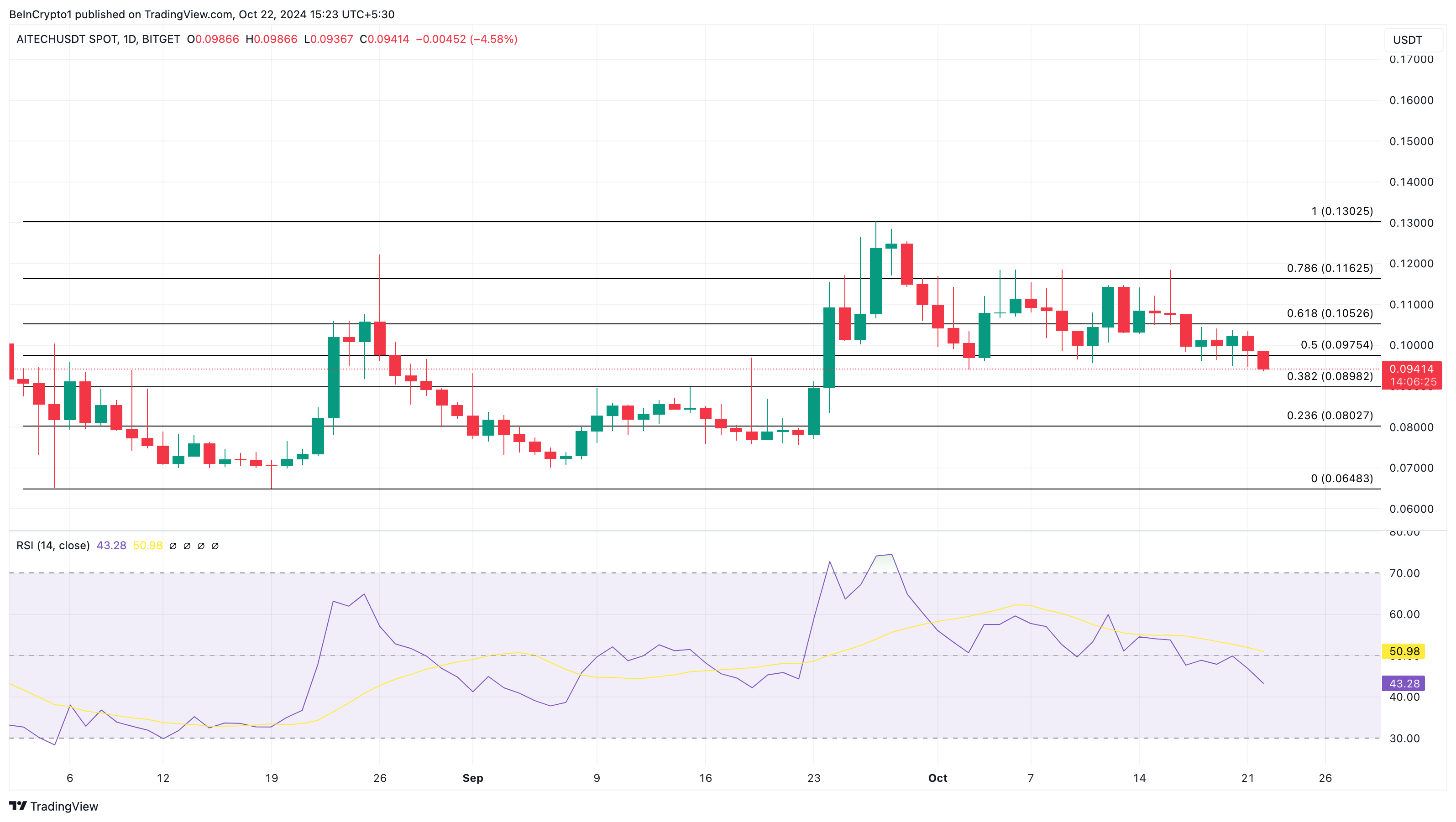 यह तीसरी बार है जब AITECH BeInCrypto की ट्रेंडिंग अल्टकॉइन्स की सूची में है। इस बार, कीमत में वृद्धि नहीं हुई है क्योंकि इसमें 24 घंटों में केवल 3% की मामूली गिरावट देखी गई है। हालांकि, यह प्रोजेक्ट में बाजार की व्यापक रुचि के कारण इस सूची में बना हुआ है