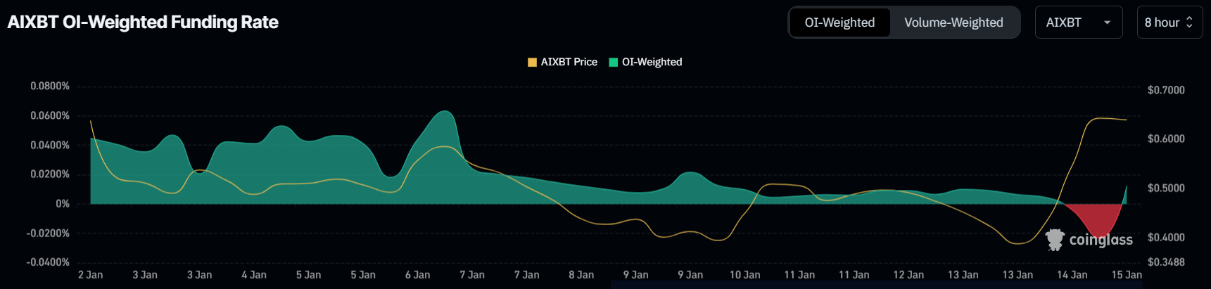 AIXBT का ओपन इंटरेस्ट पिछले 24 घंटों में दोगुने से अधिक हो गया है, $73 मिलियन से बढ़कर $154 मिलियन हो गया है। यह महत्वपूर्ण वृद्धि बाजार सहभागियों से बढ़ती रुचि को दर्शाती है, जिसमें altcoin रिटेल और संस्थागत निवेशकों के बीच लोकप्रिय हो रहा है। ओपन इंटरेस्ट में यह उछाल एसेट के साथ बढ़ती भागीदारी को दर्शाता है।