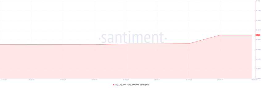 Injective टोकन भी इस सप्ताह क्रिप्टो व्हेल्स द्वारा खरीदे गए अल्टकॉइन्स में शामिल है। Santiment के अनुसार, 10 मिलियन से 100 मिलियन INJ रखने वाले पतों का बैलेंस 80.49 मिलियन से बढ़कर 80.70 मिलियन हो गया।