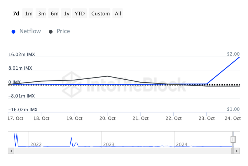 IntoTheBlock के डेटा से पता चलता है कि बड़े निवेशकों द्वारा रखे गए IMX का नेट फ्लो 288,177 टोकन्स से बढ़कर 16.02 मिलियन हो गया। यह अक्टूबर के चौथे सप्ताह में लगभग 15.71 मिलियन IMX टोकन्स की नेट खरीद को दर्शाता है।