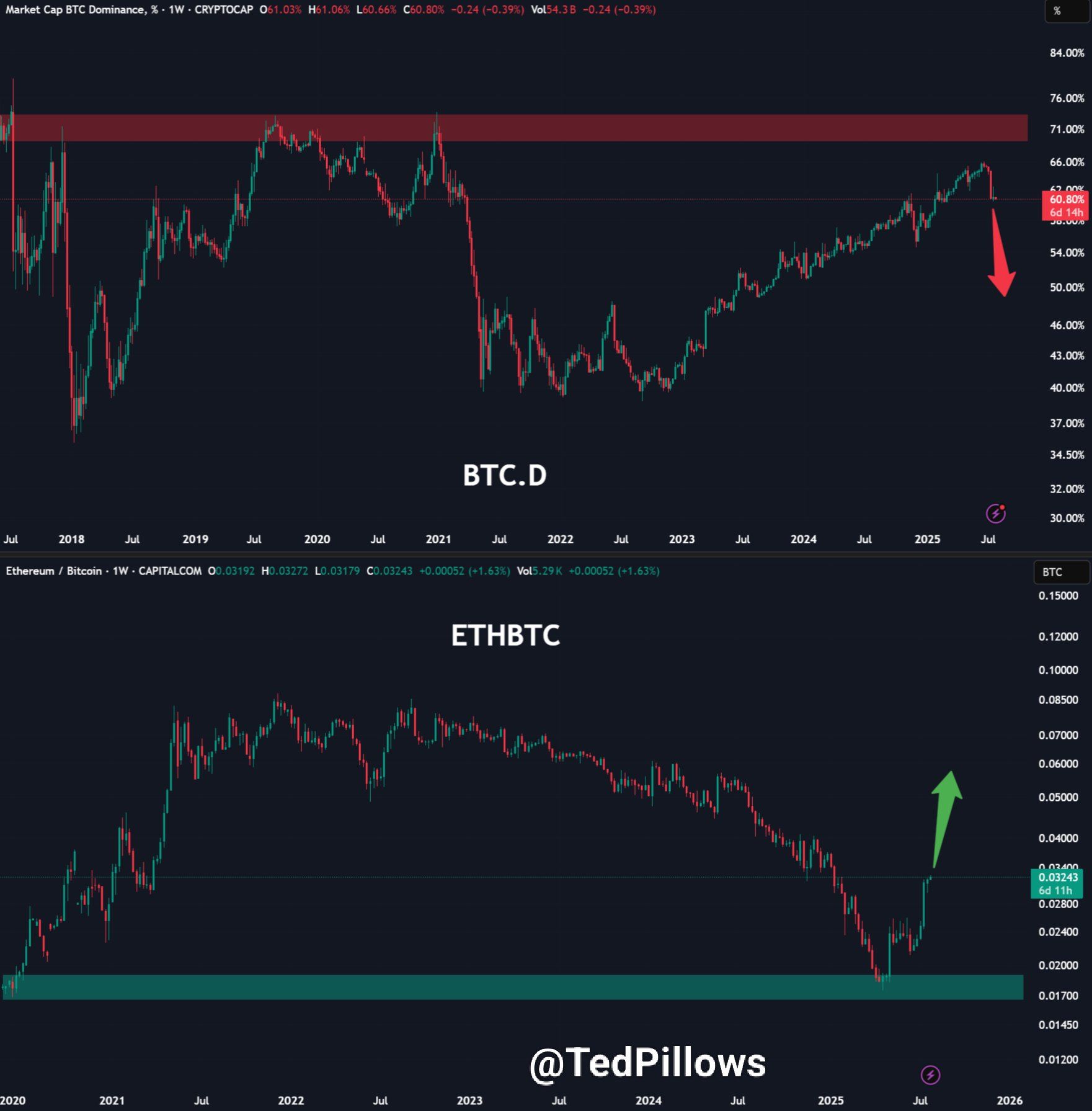 इसके अलावा, BTC.D ने आधिकारिक तौर पर अपनी तीन-वर्षीय अपट्रेंड लाइन को तोड़ दिया है। इसे व्यापक रूप से एक सबसे मजबूत संकेत के रूप में देखा जाता है कि Bitcoin की मार्केट ताकत कमजोर हो रही है।