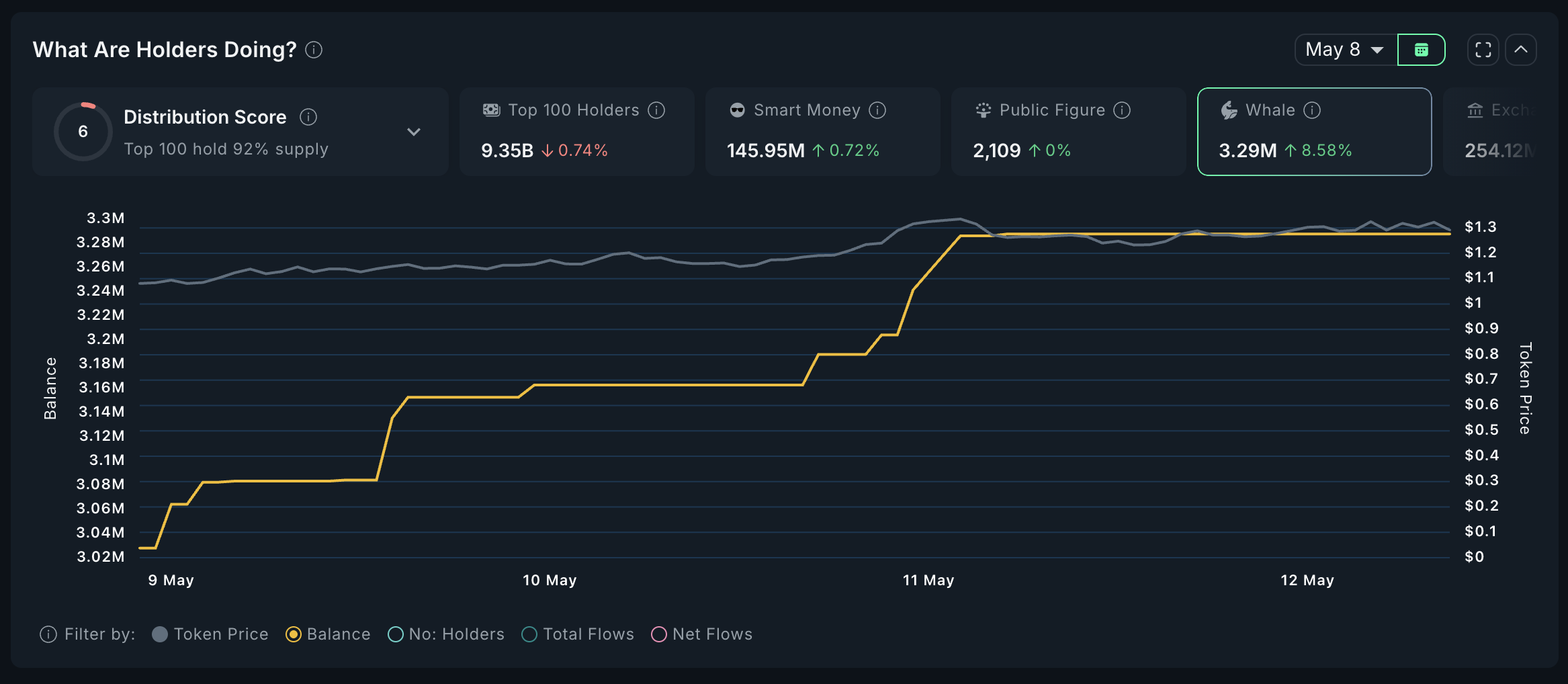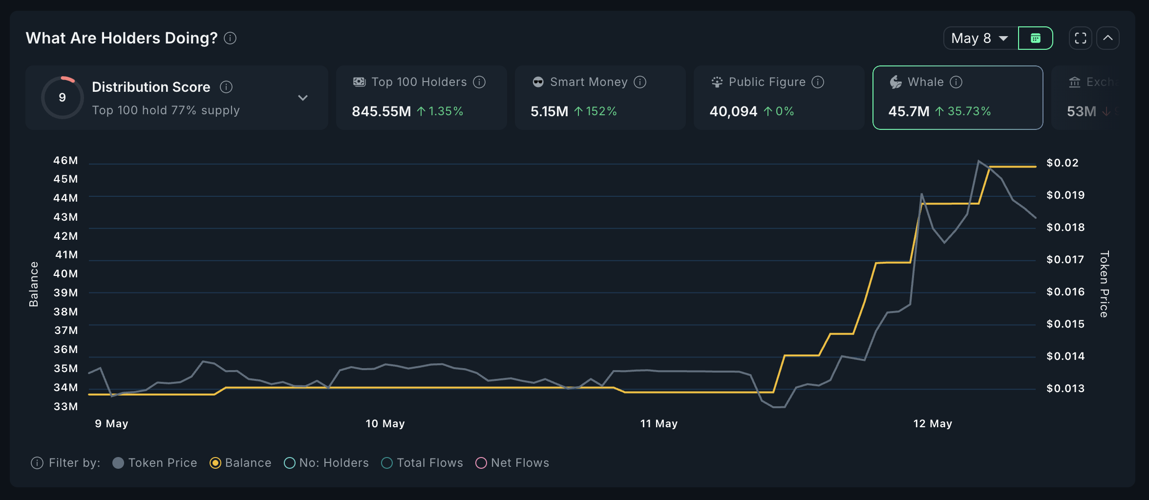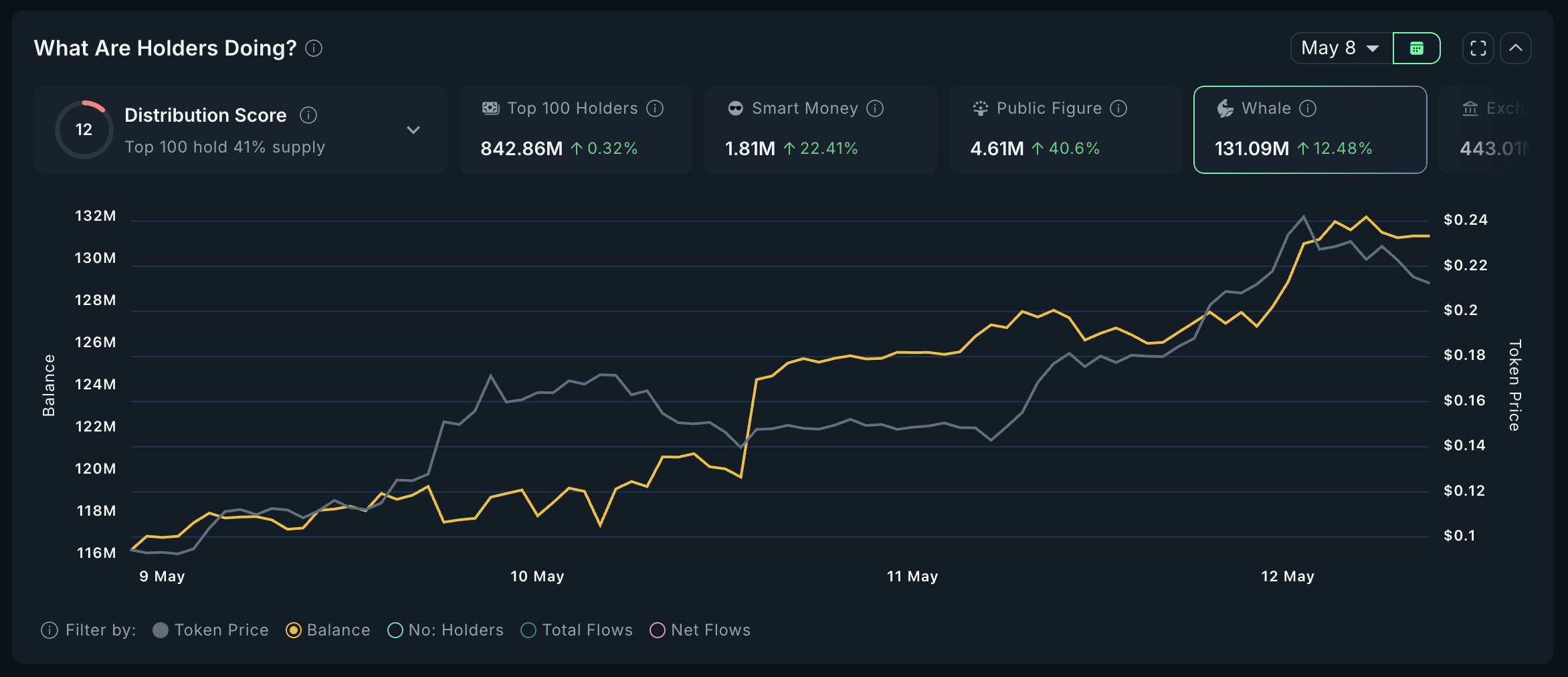 व्हेल गतिविधि भी बढ़ रही है, जिसमें बड़े होल्डर्स ने 9 मई से अपनी पोजीशन्स में 12.48% की वृद्धि की है।