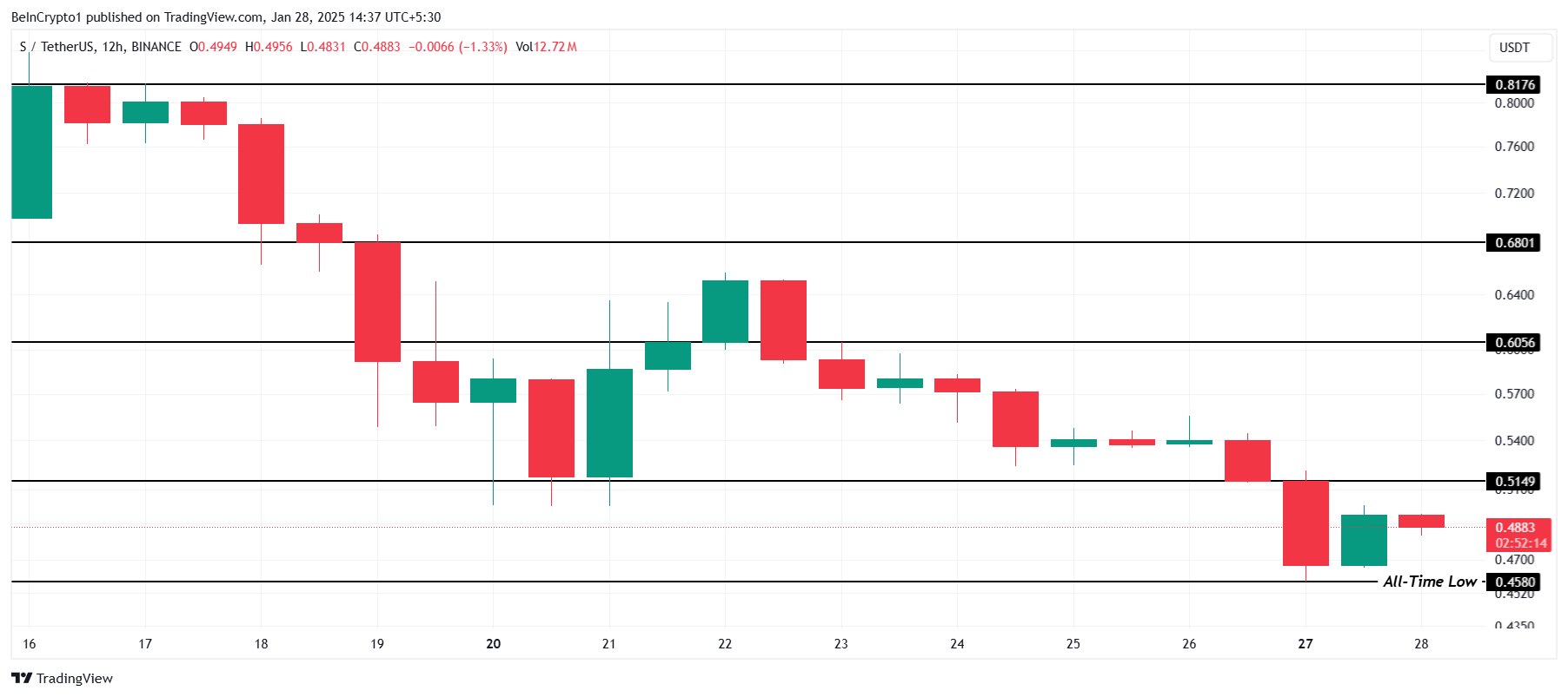 वर्तमान में $0.488 पर ट्रेड कर रहा S, $0.514 के क्रिटिकल सपोर्ट से नीचे गिरने के बाद $0.458 पर अपना नया ATL बना चुका है। इस लेवल के टूटने से bearish मोमेंटम बढ़ गया है, और ट्रेडर्स यह देख रहे हैं कि क्या टोकन स्थिर हो सकता है या अपनी गिरावट जारी रखेगा।