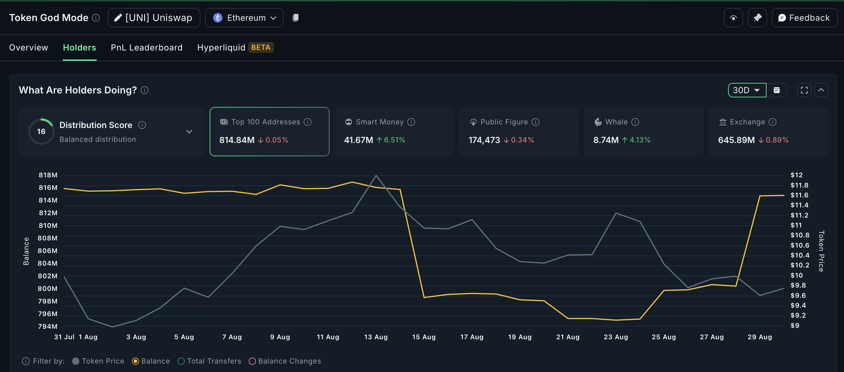 पिछले 30 दिनों में, स्मार्ट मनी की UNI होल्डिंग्स 6.51% बढ़ी हैं, जिससे उनकी कुल स्टैश 41.67 मिलियन UNI हो गई है। वर्तमान UNI प्राइस $9.77 पर, यह लगभग $24.9 मिलियन की खरीदारी में तब्दील होता है।