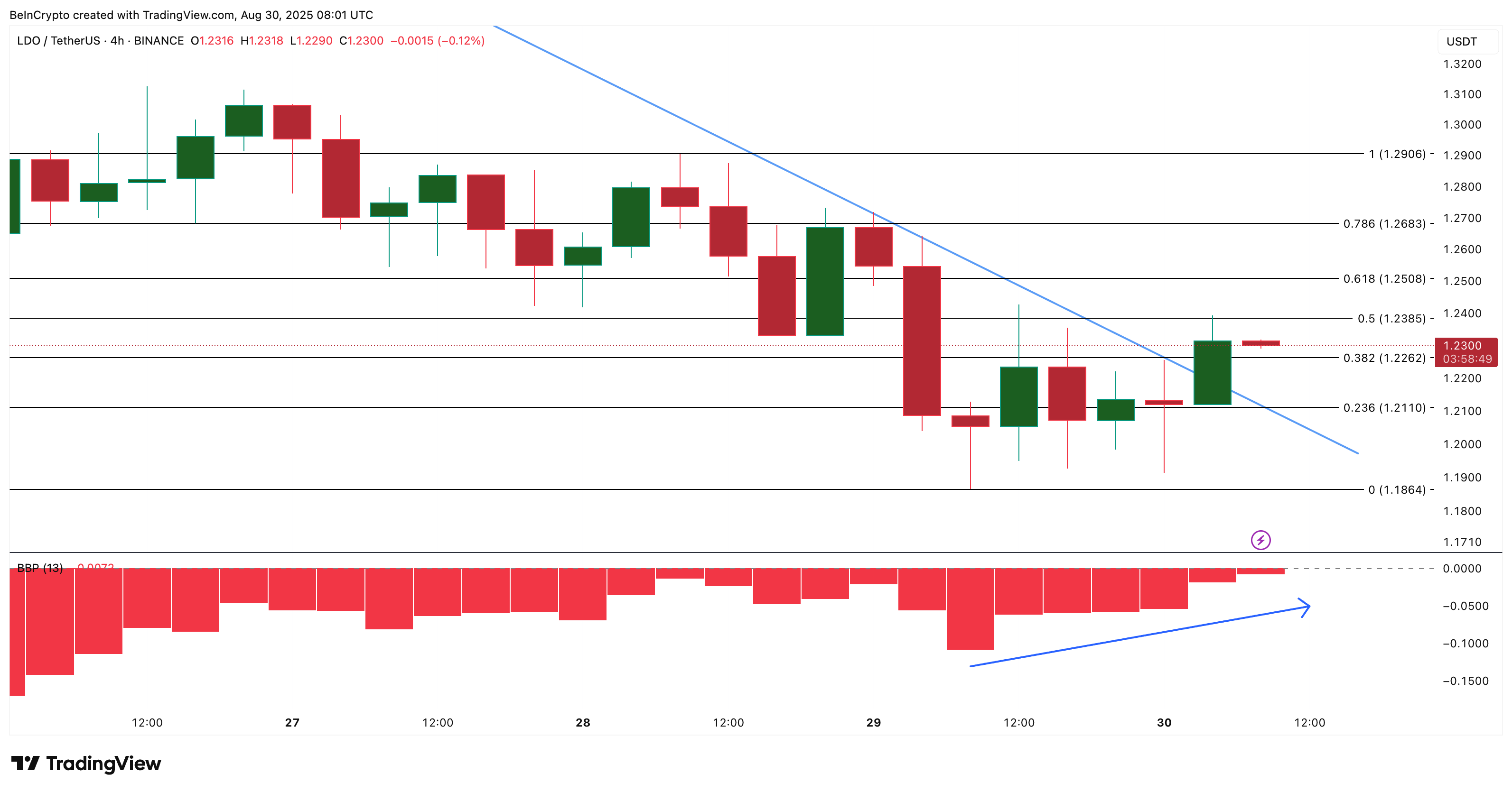 तकनीकी रूप से, 4-घंटे के चार्ट से पता चलता है कि LDO ने एक अवरोही त्रिभुज से ब्रेक किया है जिसने 23 अगस्त से प्राइस एक्शन को सीमित कर दिया था।