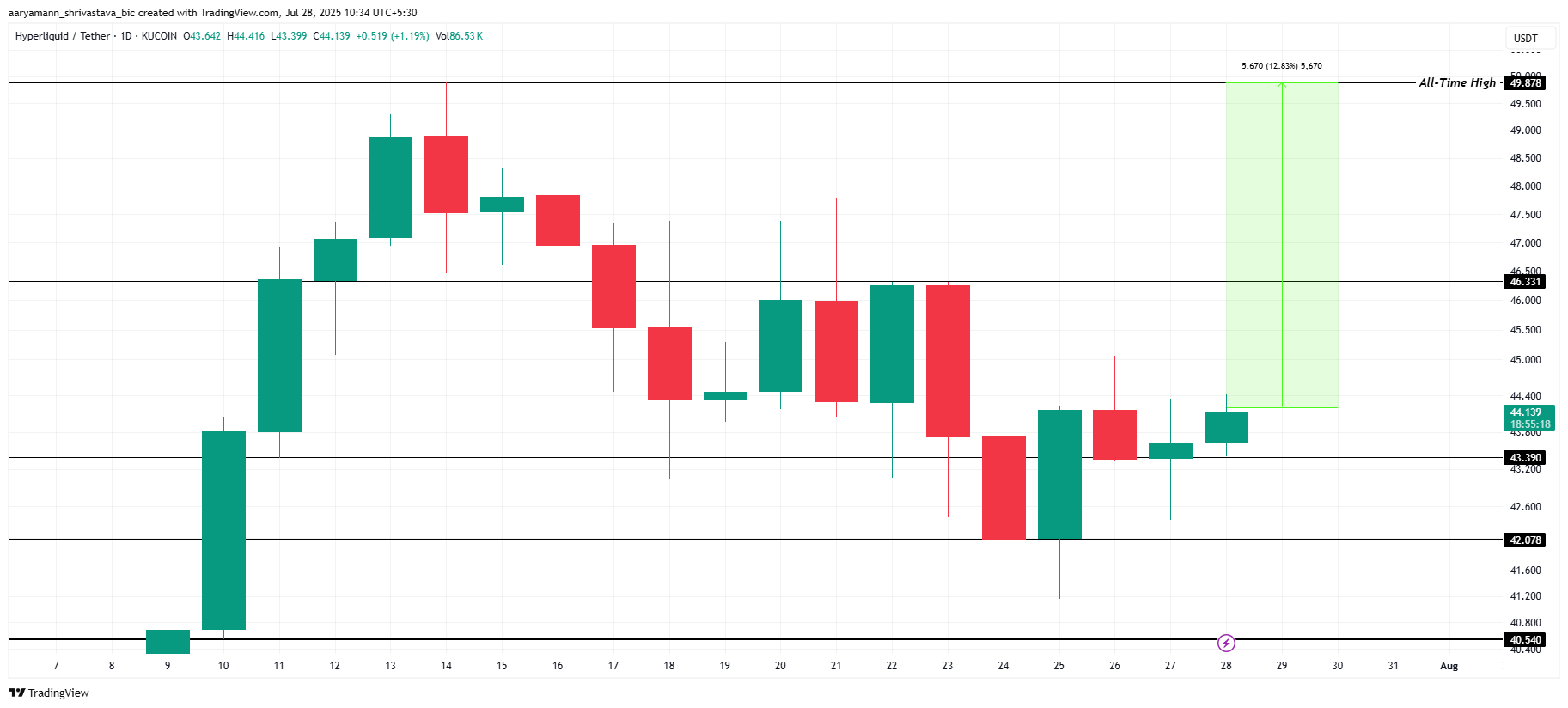 HYPE ने $42 की गिरावट के बाद हाल के दिनों में कुछ स्थिरता दिखाई है। altcoin वर्तमान में $44 पर ट्रेड कर रहा है, जो इसे इसके ऑल-टाइम हाई (ATH) $49 से लगभग 12% दूर छोड़ता है। यह रिकवरी संकेत देती है कि अगर व्यापक मार्केट अनुकूल रहता है तो वृद्धि की संभावना है।