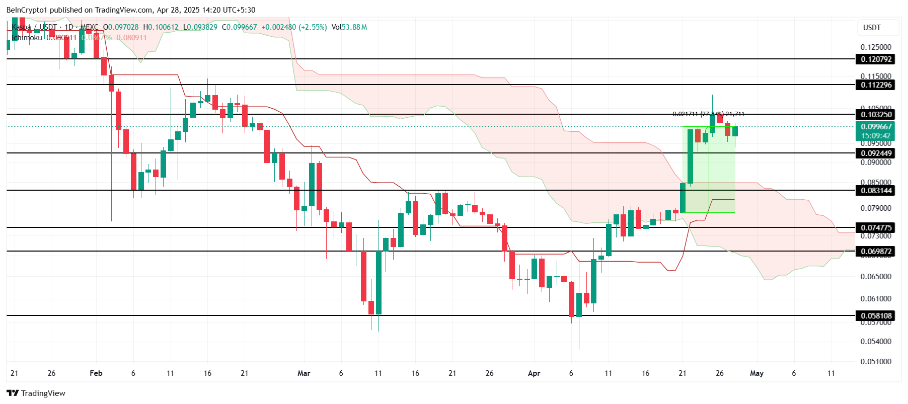 KAS ने पिछले सप्ताह में 27% की वृद्धि की है, जिससे Ichimoku Cloud से bearish संकेतों को अमान्य करने में मदद मिली है। वर्तमान में $0.099 पर ट्रेड कर रहा है, altcoin महत्वपूर्ण $0.103 प्रतिरोध स्तर के करीब है। यदि यह मोमेंटम जारी रहता है, तो KAS संभावित रूप से इसे तोड़ सकता है और एक नया बुलिश ट्रेंड स्थापित कर सकता है।
