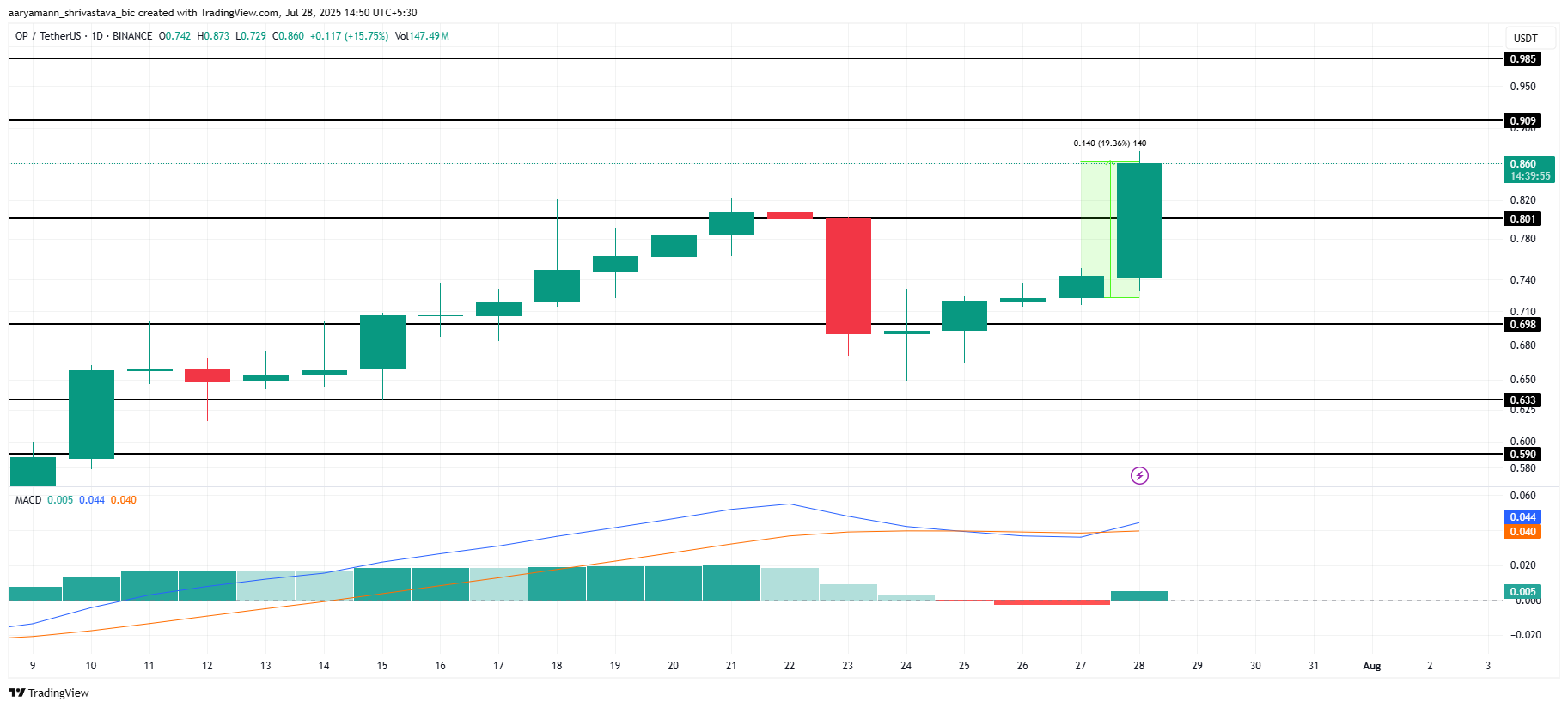 Optimism (OP) हाल ही में सबसे अच्छा प्रदर्शन करने वाले टोकन्स में से एक रहा है, पिछले 24 घंटों में 19.3% की वृद्धि के साथ $0.86 पर ट्रेड कर रहा है। यह वृद्धि अगस्त में आने वाले टोकन अनलॉक के पहले सकारात्मक भावना से समर्थित है।