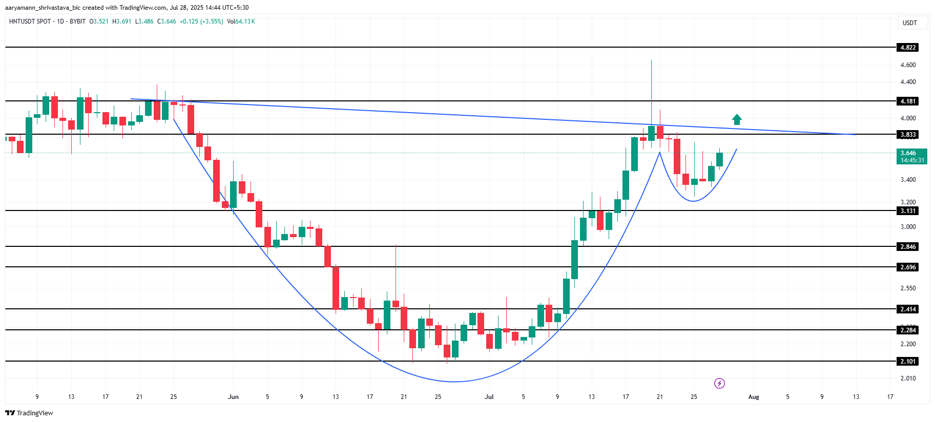 Helium की कीमत वर्तमान में $3.64 पर ट्रेड कर रही है, एक कप-एंड-हैंडल पैटर्न बना रही है, जो संभावित बुलिश मोमेंटम का संकेत दे रही है। यह पैटर्न आमतौर पर एक अपवर्ड प्राइस मूवमेंट के बाद आता है, जिसे पिछले सप्ताह के हल्के पुलबैक द्वारा पुष्टि की गई है। यदि मार्केट की स्थिति अनुकूल रहती है, तो यह HNT के लिए और अधिक लाभ की ओर ले जा सकता है।