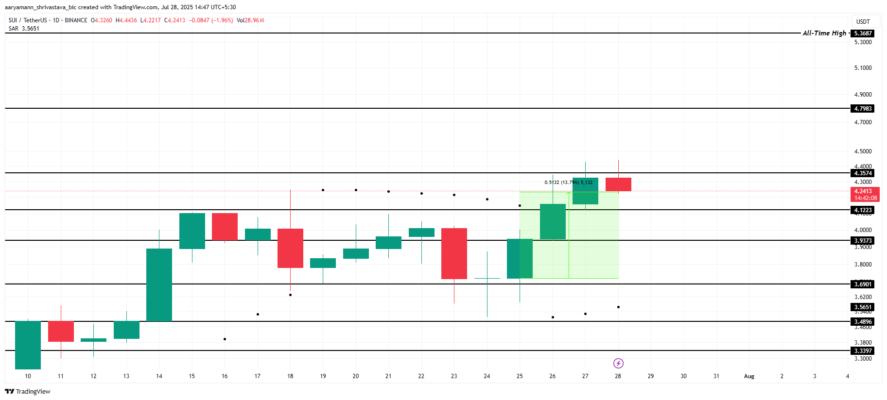 कैंडलस्टिक्स के नीचे का Parabolic SAR इंडिकेटर सुझाव देता है कि यह altcoin अपनी अपवर्ड ट्रेंड जारी रख सकता है। अगर यह मोमेंटम बना रहता है, तो SUI $4.35 के रेजिस्टेंस लेवल को पार कर सकता है और आने वाले दिनों में $4.79 की ओर बढ़ सकता है, जो क्रिप्टोकरेन्सी के लिए आगे की पॉजिटिव मूवमेंट का संकेत देगा।
