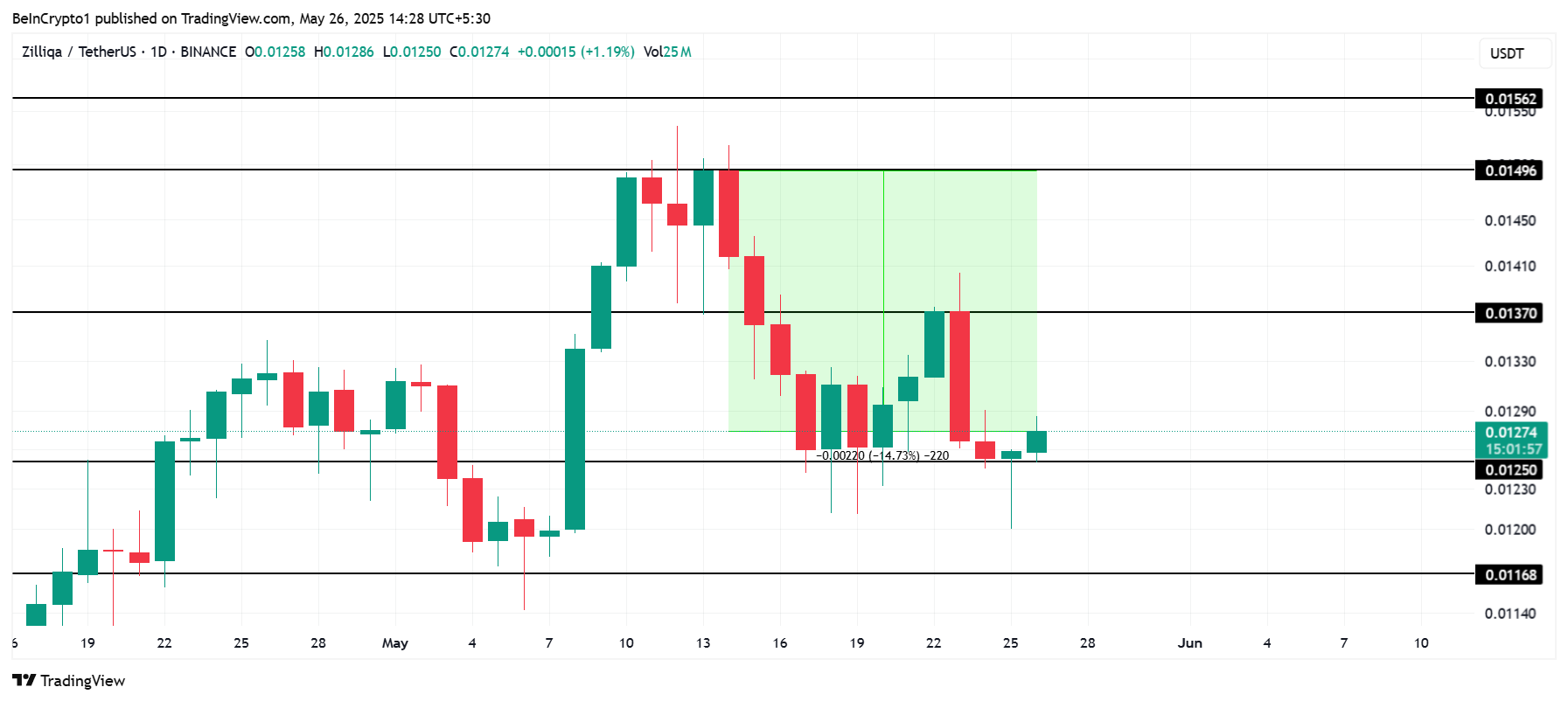 अगर ZIL मोमेंटम का फायदा उठाने में असफल रहता है, तो कीमत $0.0125 और $0.0137 के बीच कंसोलिडेट हो सकती है। इस तरह की साइडवेज मूवमेंट बुलिश आउटलुक को कमजोर कर देगी, जो अगले बड़े मूव से पहले अनिश्चितता की अवधि का संकेत देती है।