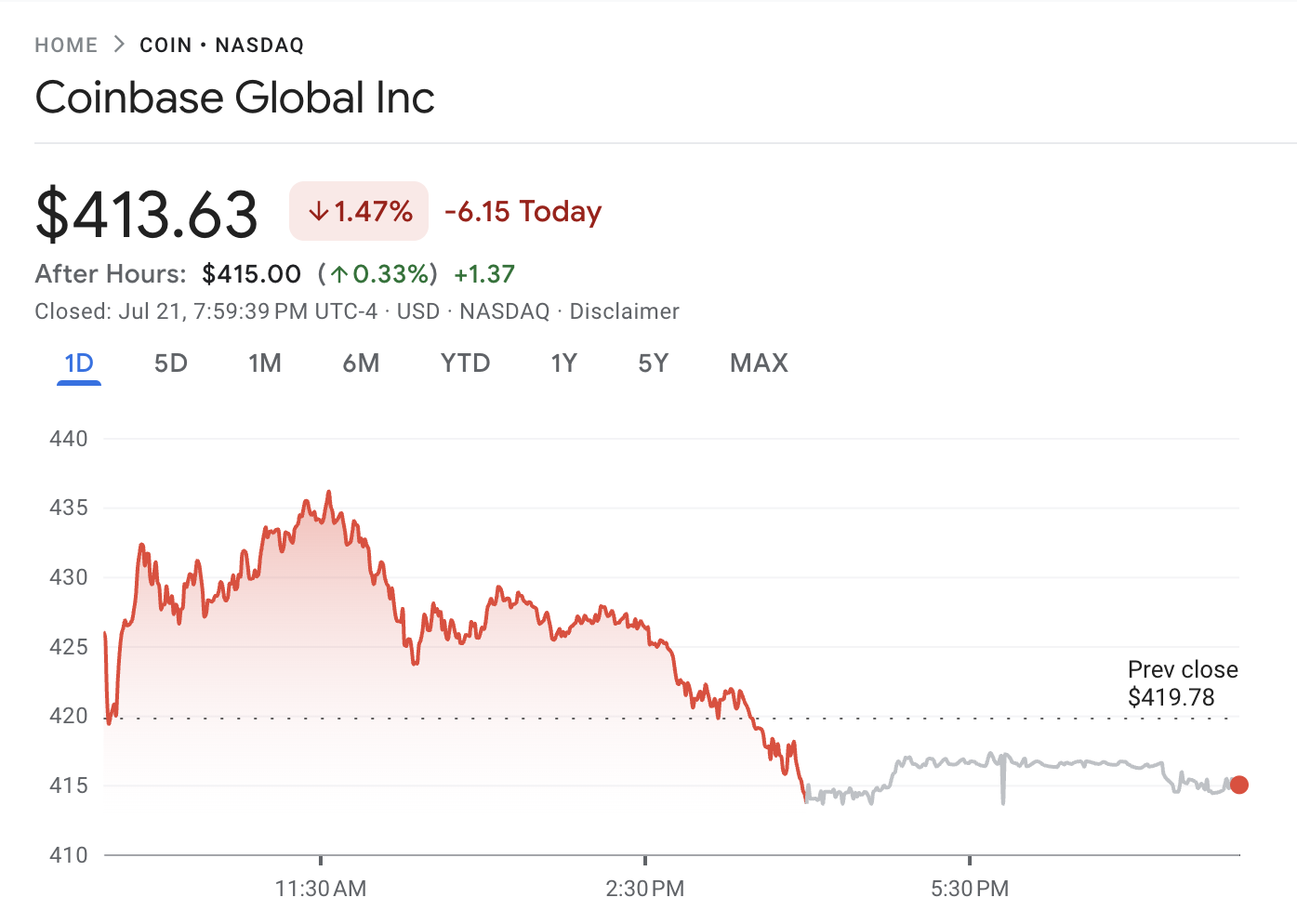 इस बीच, इन सेल-ऑफ़ के दौरान, COIN में मामूली गिरावट आई। Google Finance के डेटा के अनुसार, शेयर कल $413.63 पर बंद हुए, जो 1.47% की गिरावट थी। हालांकि, प्री-मार्केट ट्रेडिंग में कीमत में 0.3% की छोटी वृद्धि देखी गई।