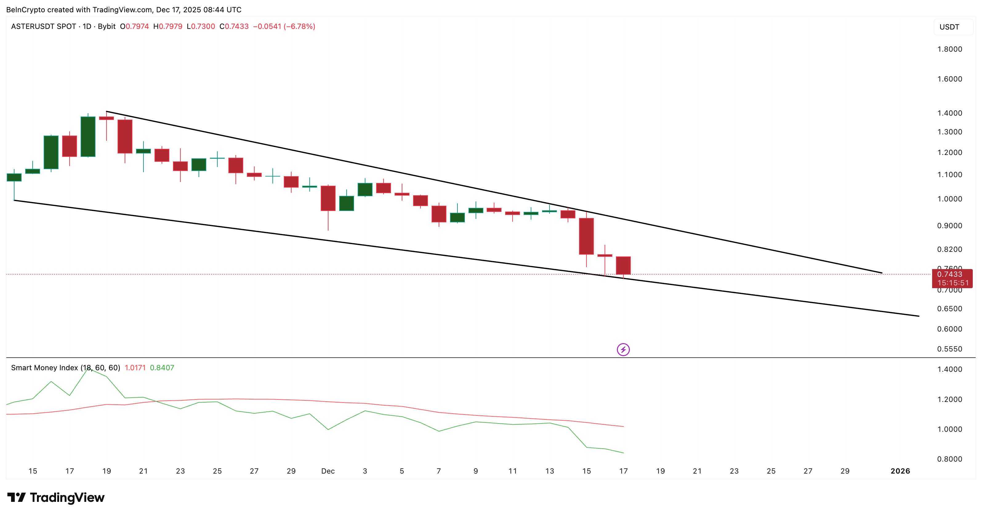 चार्ट में, Aster अभी भी गिरते हुए wedge के अंदर है और निचली ट्रेंडलाइन को टेस्ट कर रहा है। इस तरह की स्ट्रक्चर में अकसर bounce देखने को मिलता है, लेकिन जब खरीदार आते हैं तभी। फिलहाल, खरीदार एक्टिव नहीं हैं।