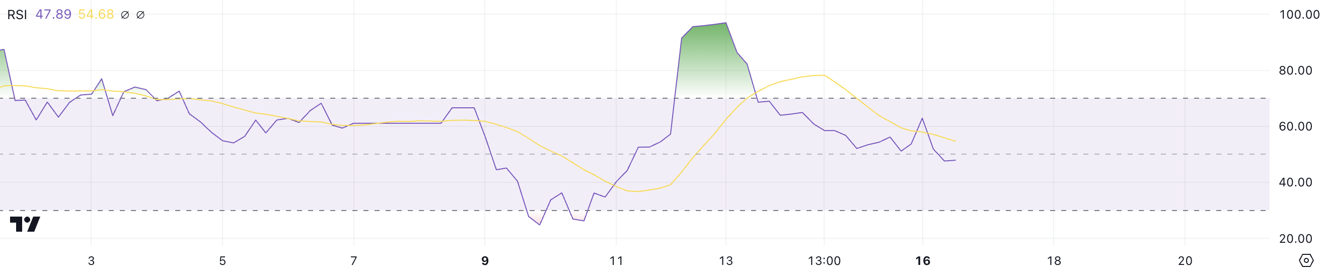 RSI के 47.8 पर होने के साथ, AVA की कीमत अब तटस्थ क्षेत्र में है, जो संकेत देता है कि पहले की वृद्धि थम गई है, और संपत्ति न तो खरीदी गई है और न ही बेची गई है। 96 से यह गिरावट गति के नुकसान को उजागर करती है, जो सुझाव देती है कि कीमत स्थिर हो सकती है या आगे समेकन का सामना कर सकती है।