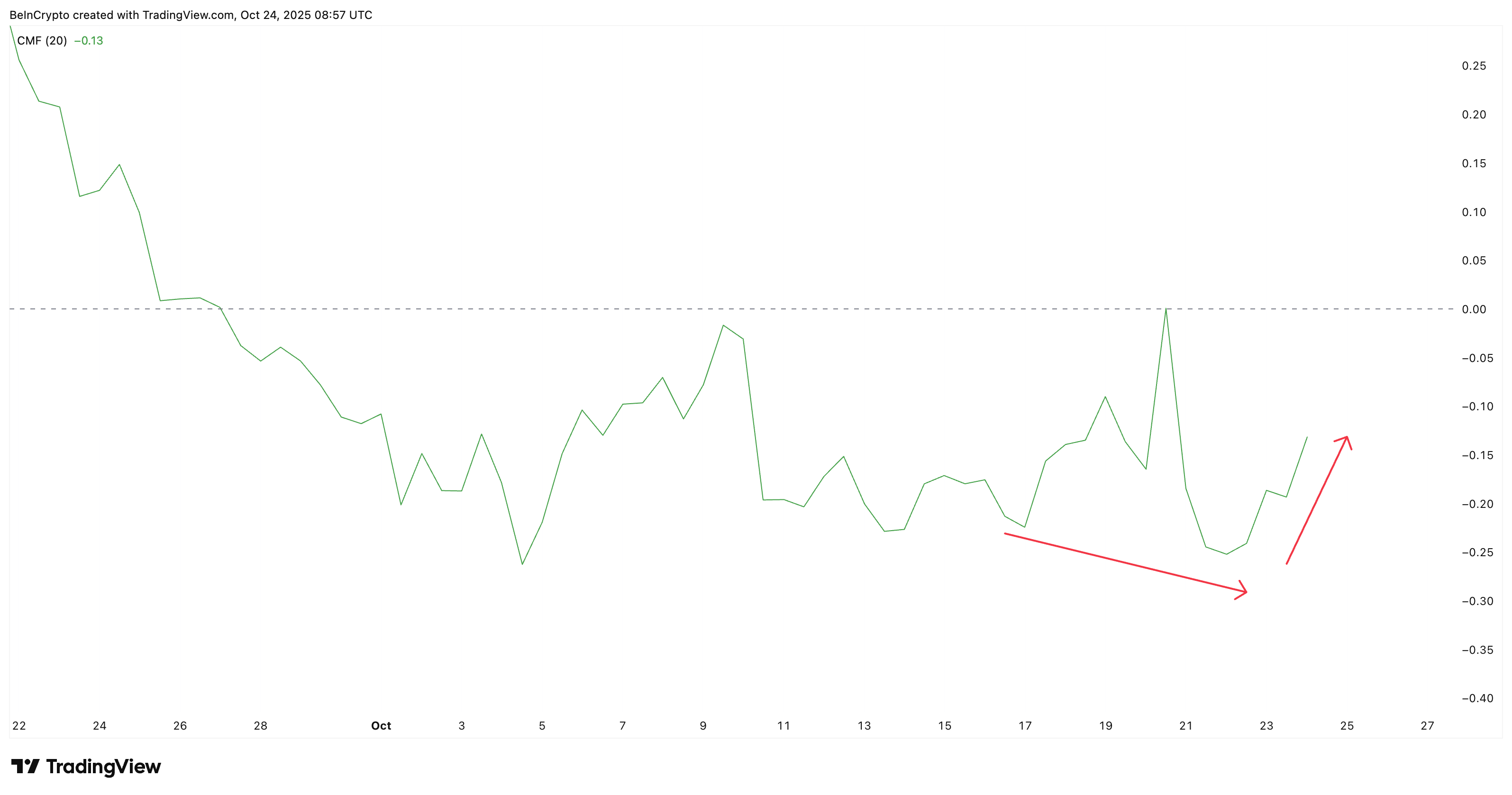 Chaikin Money Flow (CMF), जो यह मापता है कि बड़े (संभावित व्हेल) पैसे किसी कॉइन में प्रवेश कर रहे हैं या छोड़ रहे हैं, अभी भी कमजोरी का संकेत देता है।