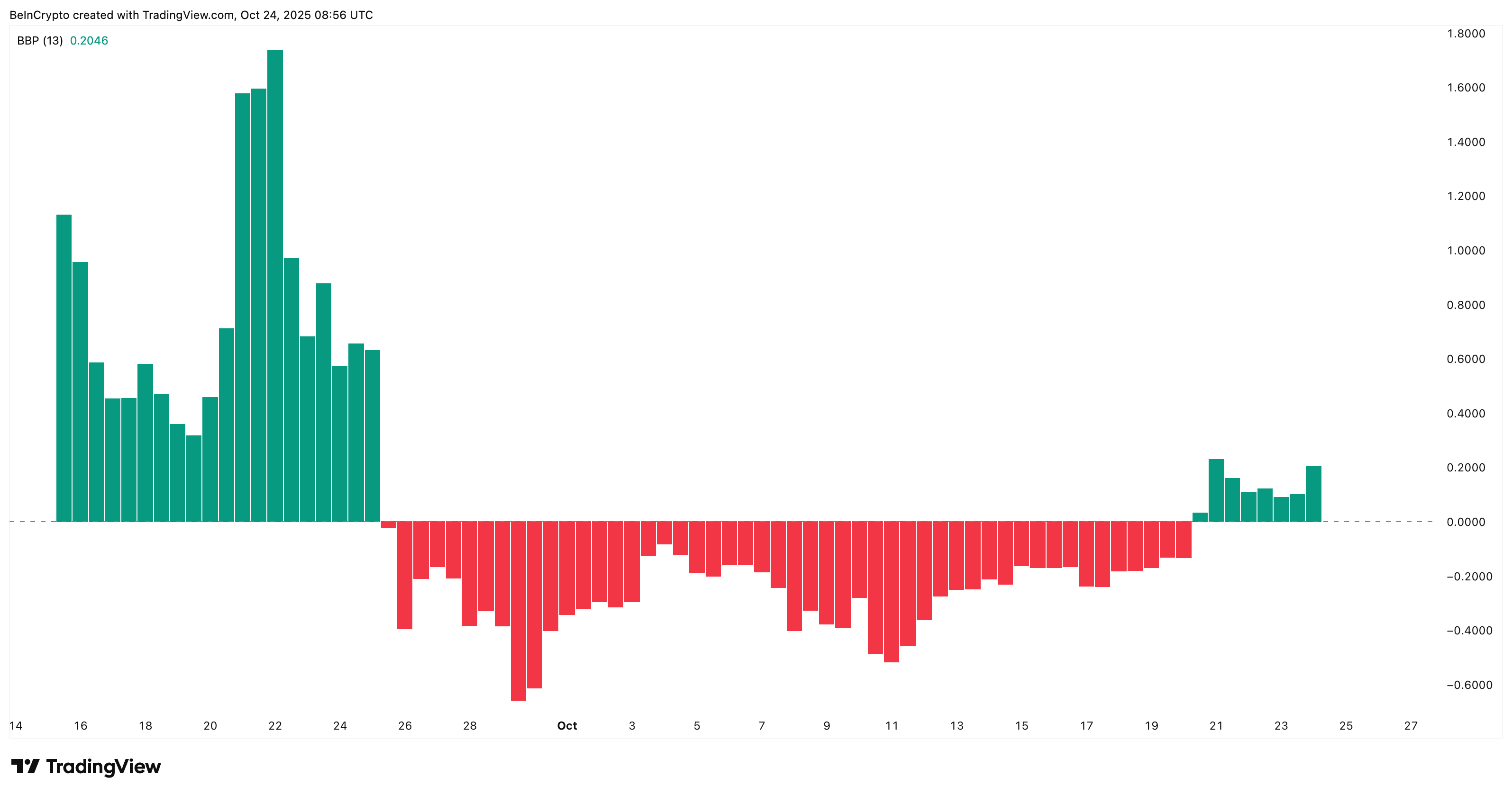 Bull Bear Power (BBP) इंडिकेटर, जो खरीद और बिक्री के दबाव की तुलना करता है, यह ट्रैक करके कि कीमतें औसत से कितनी दूर जाती हैं, 20 अक्टूबर से हरा हो गया है।