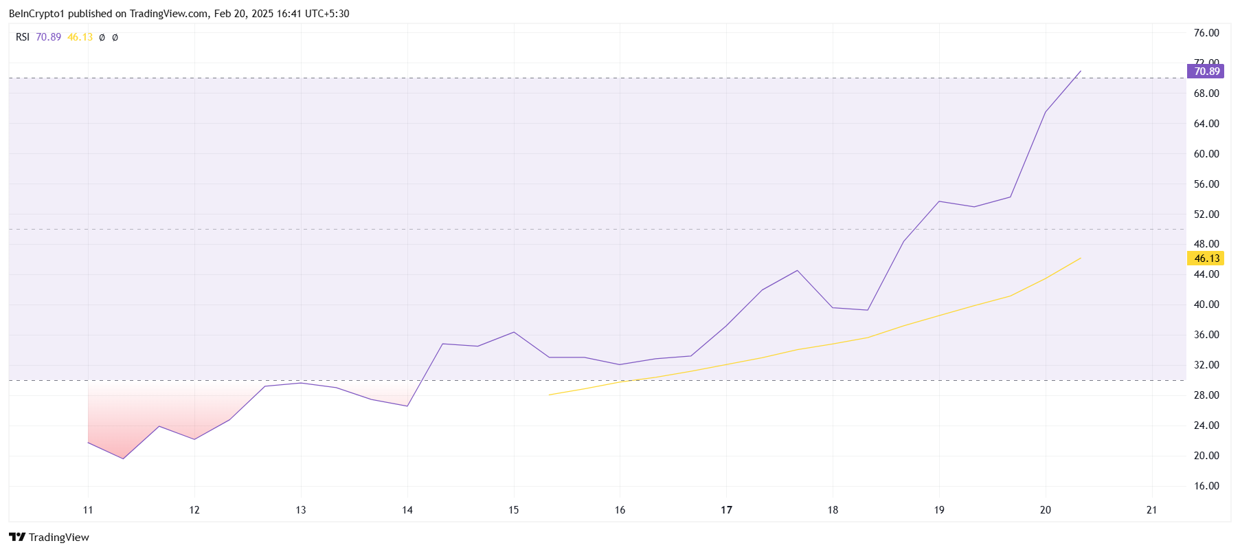 तकनीकी दृष्टिकोण से, BERA का मैक्रो मोमेंटम चेतावनी संकेत प्रस्तुत करता है। रिलेटिव स्ट्रेंथ इंडेक्स (RSI) ओवरबॉट जोन में प्रवेश कर चुका है, 70.0 की सीमा को पार करते हुए। ऐतिहासिक रूप से, ऐसे स्तरों ने प्राइस करेक्शन से पहले संकेत दिए हैं, क्योंकि ट्रेडर्स मुनाफा लेते हैं और मोमेंटम धीमा हो जाता है।