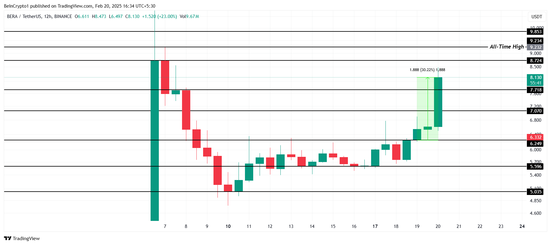 वर्तमान में, BERA $8.13 पर ट्रेड कर रहा है, $8.72 पर रेजिस्टेंस को पार करने की कोशिश कर रहा है। यह altcoin $7.71 को एक महत्वपूर्ण सपोर्ट लेवल के रूप में मजबूत करने की भी कोशिश कर रहा है। इस प्राइस से ऊपर बने रहना बुलिश भावना को मजबूत करेगा, संभावित रूप से आगे के लाभ का मार्ग प्रशस्त करेगा।