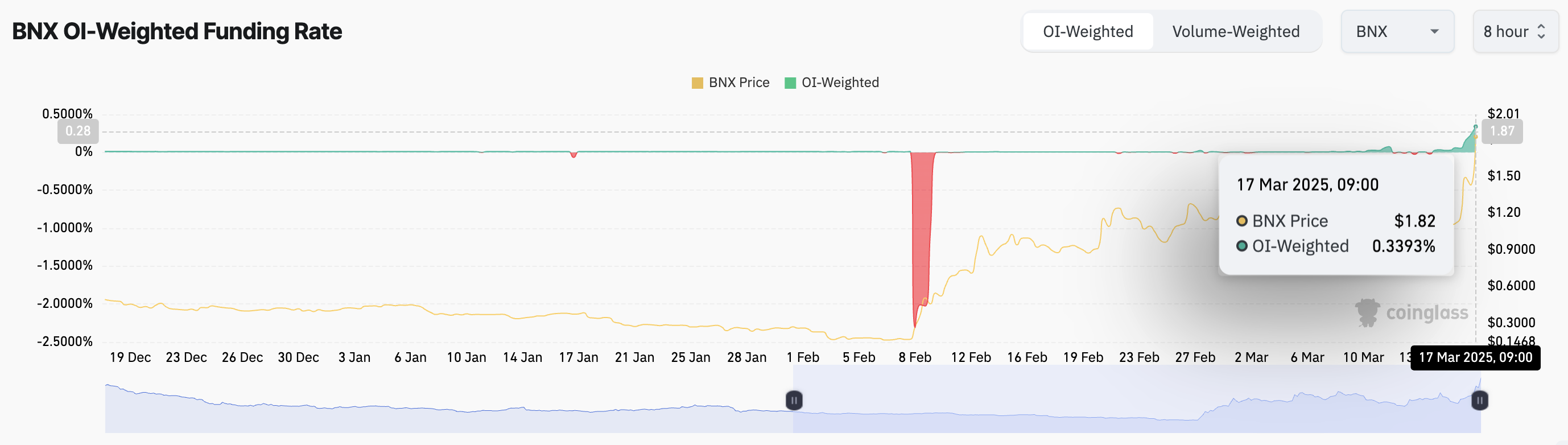 ओपन इंटरेस्ट उन सभी डेरिवेटिव कॉन्ट्रैक्ट्स की कुल संख्या को ट्रैक करता है, जैसे कि फ्यूचर्स या ऑप्शंस, जो अभी तक सेटल नहीं हुए हैं। जब यह इस तरह की प्राइस रैली के दौरान बढ़ता है, तो यह बढ़ती बाजार भागीदारी को दर्शाता है। यह BNX धारकों के बीच बुलिश विश्वास को संकेत करता है क्योंकि अधिक ट्रेडर्स अपवर्ड मोमेंटम का लाभ उठाने के लिए नई पोजीशन खोलते हैं।