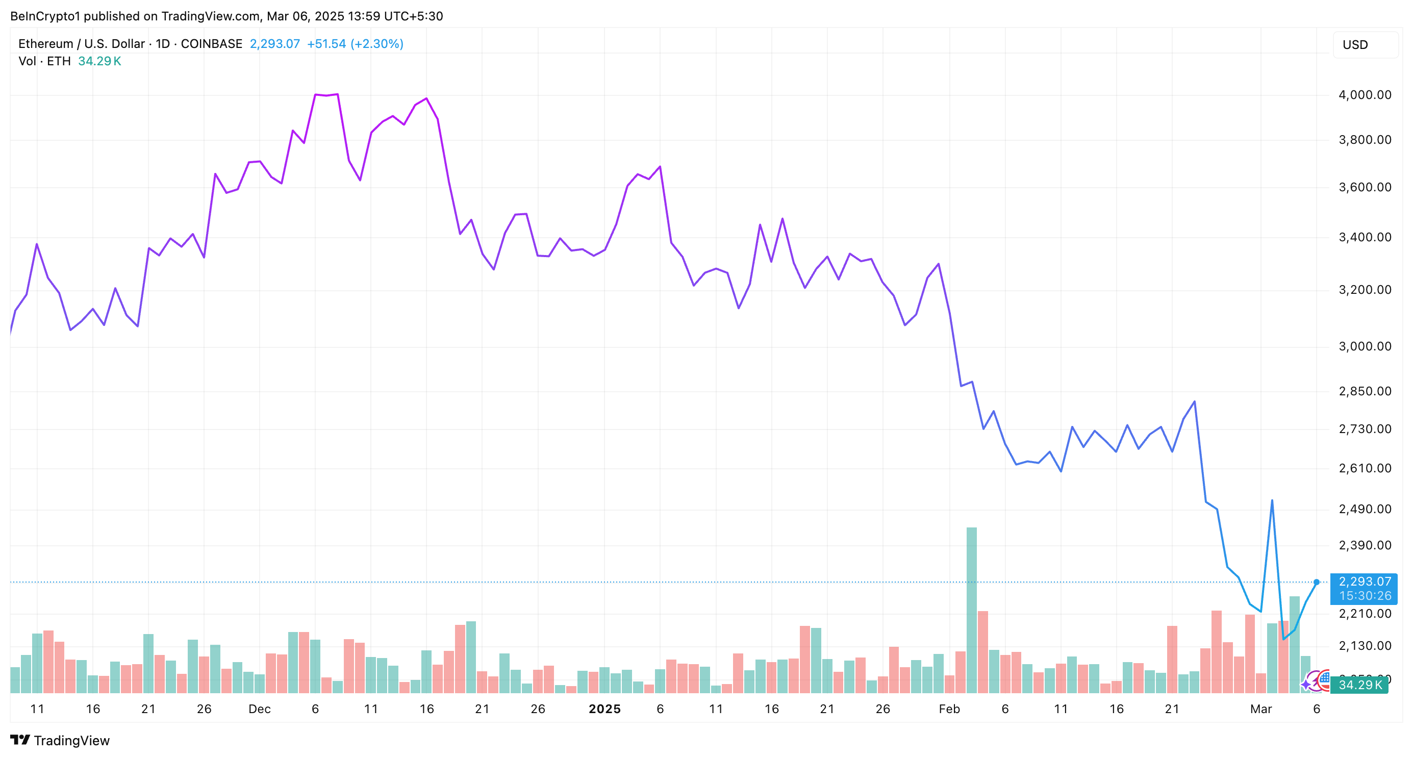 पिछले महीने में ही, ETH ने अपने लाभ का 15.8% खो दिया है। प्रेस समय पर, यह $2,293 पर ट्रेड कर रहा था। BeInCrypto डेटा के अनुसार, यह पिछले दिन के मुकाबले 3.3% की मामूली वृद्धि दर्शाता है।