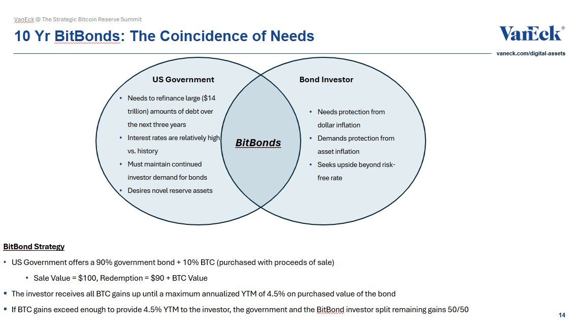VanEck के डिजिटल एसेट्स रिसर्च के प्रमुख Matthew Sigel ने “BitBonds” नामक एक नया वित्तीय साधन प्रस्तावित किया है, जो अमेरिकी सरकार की $14 ट्रिलियन पुनर्वित्त ऋण आवश्यकता को प्रबंधित करने में मदद करेगा।