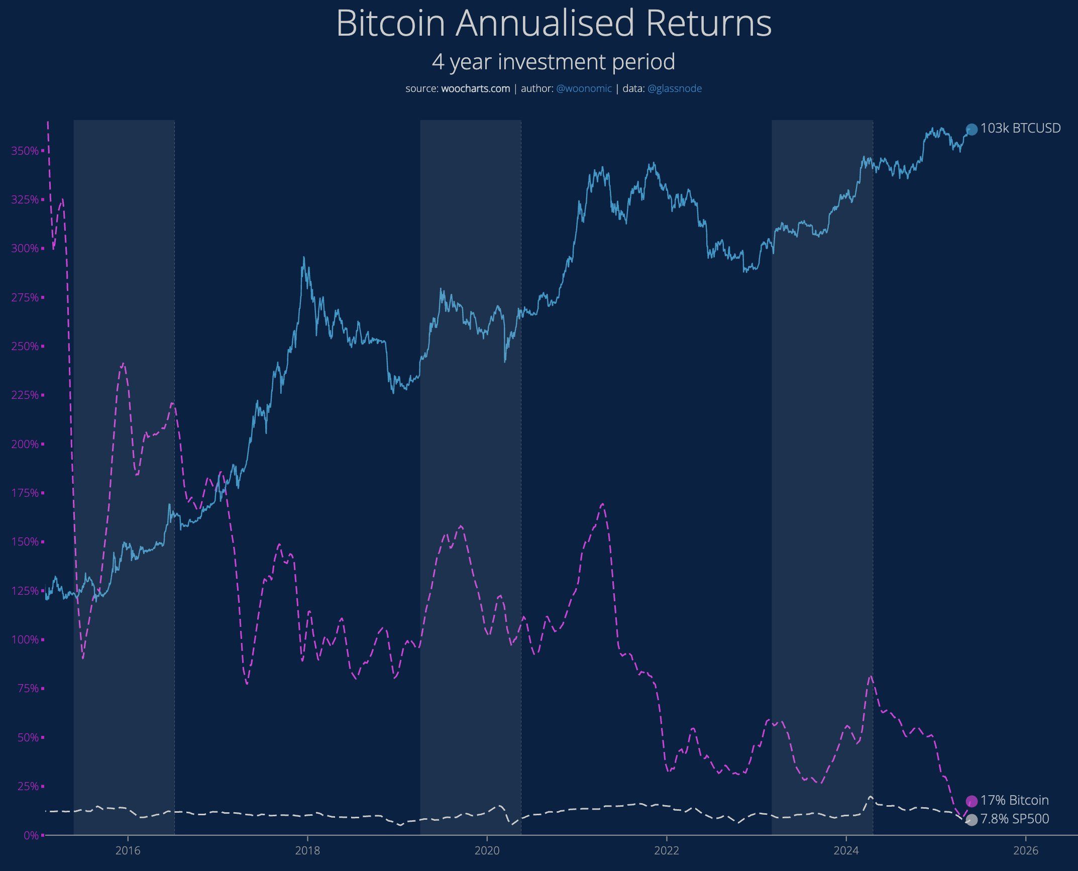 Woo ने एक चार्ट साझा किया जिसका शीर्षक “Bitcoin Annualised Returns” है, जिसमें दिखाया गया है कि Bitcoin की कंपाउंड वार्षिक वृद्धि दर (CAGR) 2017 में 100% से अधिक से घटकर 2020 के बाद लगभग 30–40% हो गई है।