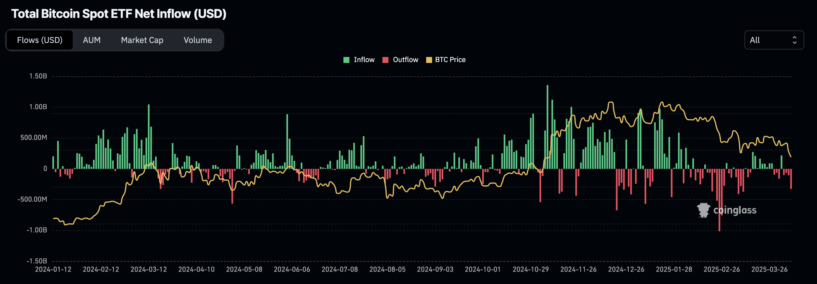 Bitcoin Spot ETFs में 11 मार्च के बाद से सबसे बड़ा दैनिक ऑउटफ्लो ($326 मिलियन) हुआ।