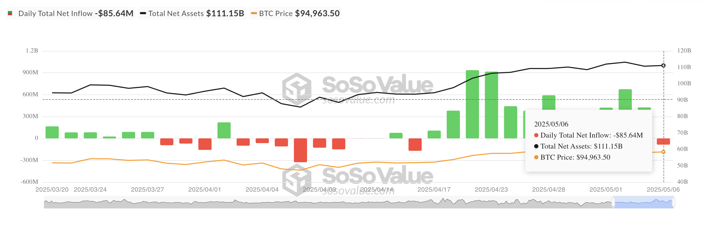 BTC स्पॉट ETFs ने मंगलवार को $85.64 मिलियन का नेट ऑउटफ्लो देखा, जो आज के यूएस फेडरल रिजर्व की नवीनतम नीति बैठक से ठीक पहले संस्थागत निवेशकों के बीच भावना में बदलाव को दर्शाता है।