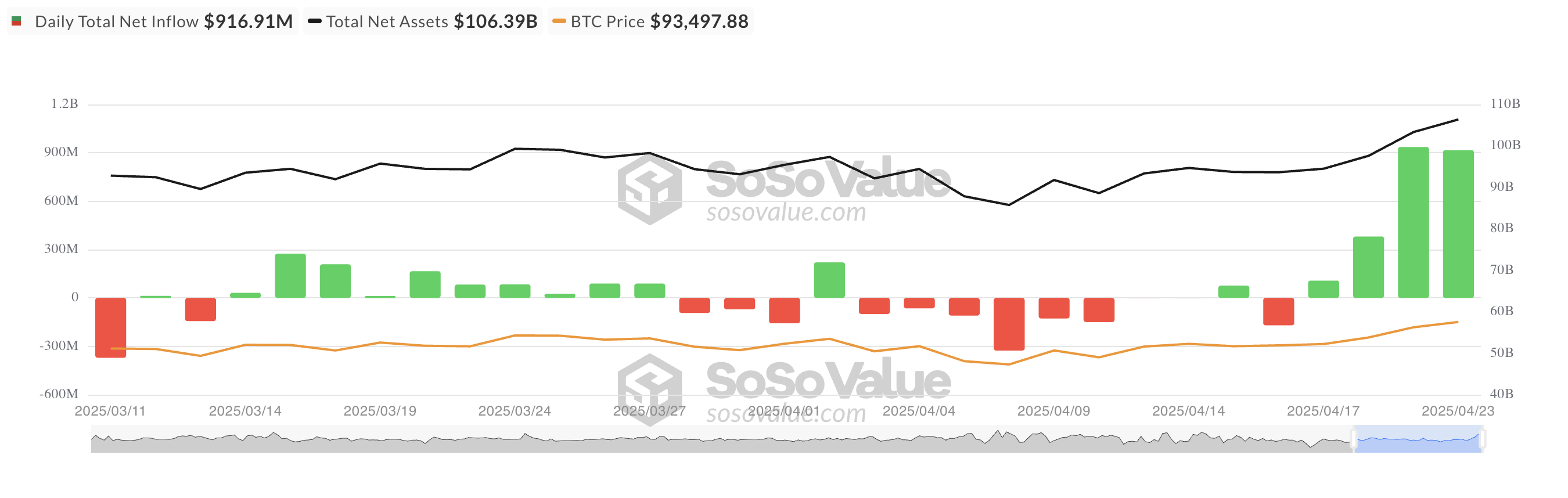 BTC स्पॉट ETFs ने बुधवार को निवेशकों की रुचि को आकर्षित किया, $916.91 मिलियन के नेट इनफ्लो के साथ अपनी इनफ्लो स्ट्रीक को बढ़ाया।