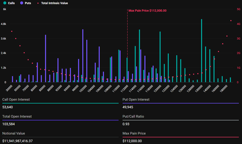 जैसा कि नीचे दिए गए चार्ट में दिखाया गया है, आज के Bitcoin एक्सपायरिंग ऑप्शंस के लिए मैक्सिमम पेन (Max Pain) स्तर $112,000 है। यहां, अधिकांश Bitcoin ऑप्शंस धारकों को सबसे अधिक वित्तीय दर्द महसूस होगा।