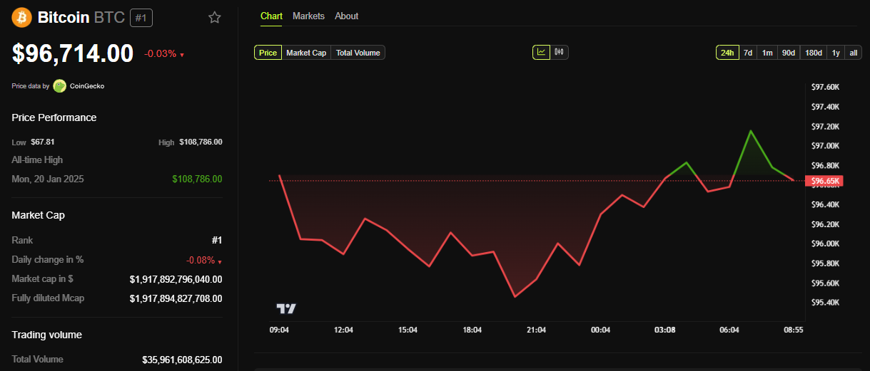 जैसे ही ऑप्शंस कॉन्ट्रैक्ट्स का एक्सपायरी समय आज 8:00 UTC पर नजदीक आता है, Bitcoin और Ethereum की कीमतें उनके संबंधित maximum pain points के करीब पहुंच सकती हैं। BeInCrypto डेटा के अनुसार, BTC का ट्रेड $96,714 पर हुआ, जबकि ETH का एक्सचेंज $2,696 पर हुआ।
