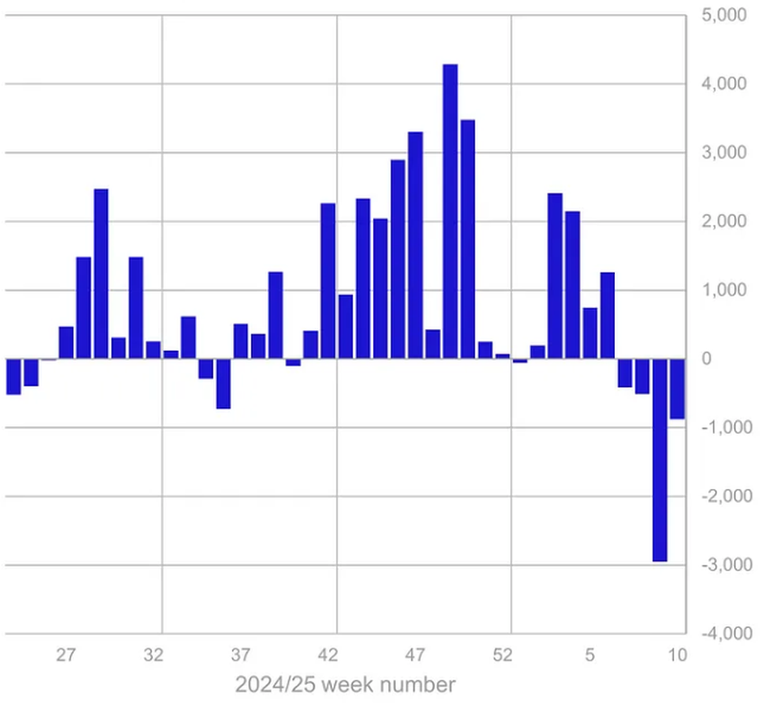 संस्थागत निवेशक लगातार चार हफ्तों से डिजिटल एसेट्स को बेच रहे हैं। 7 मार्च को समाप्त सप्ताह में $876 मिलियन का ऑउटफ्लो डिजिटल एसेट निवेश उत्पादों से हुआ।