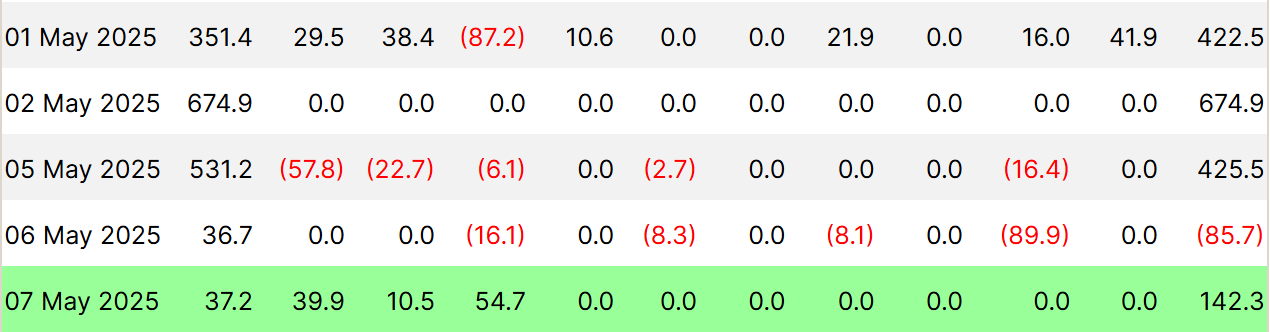मजबूत बाजार भावना के अलावा, Bitcoin का समग्र मैक्रो मोमेंटम सकारात्मक स्पॉट ETF प्रवाह द्वारा समर्थित है। ये प्रवाह पिछले सप्ताह के दौरान बड़े पैमाने पर सकारात्मक रहे हैं, सिवाय 6 मई के, जब $85 मिलियन का ऑउटफ्लो दर्ज किया गया था।