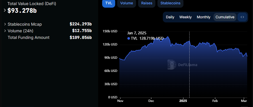 इसके अलावा, डिसेंट्रलाइज्ड फाइनेंस (DeFi) को भी झटका लगा है। DefiLlama पर डेटा दिखाता है कि कुल लॉक्ड वैल्यू (TVL) 2025 के $128.7 बिलियन के शिखर से घटकर इस लेखन के समय $93.2 बिलियन हो गई है। यह गिरावट क्रिप्टो की आर्थिक अनिश्चितता के दौरान वित्तीय स्थिरता प्रदान करने की क्षमता में व्यापक विश्वास की कमी को दर्शाती है।