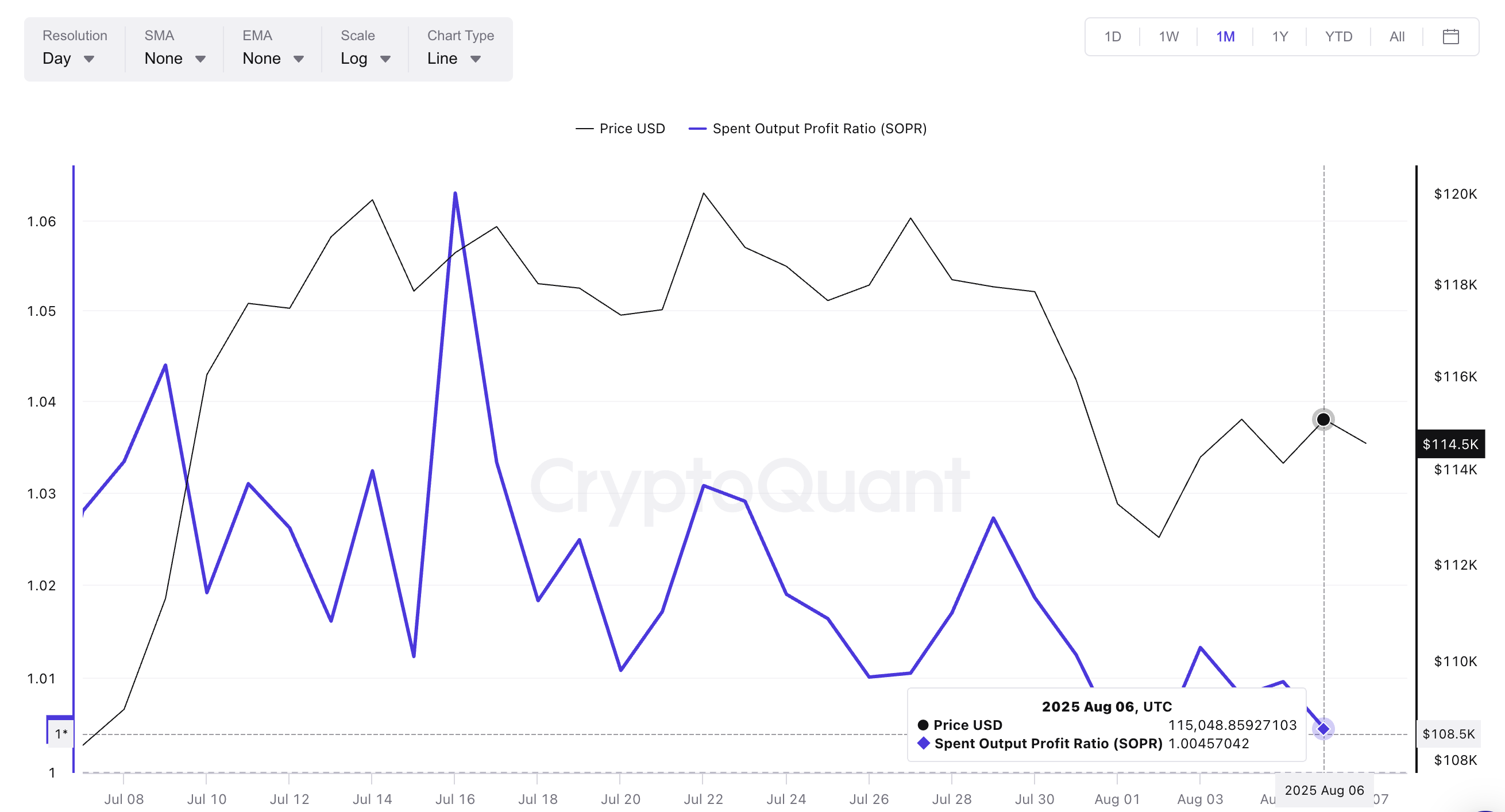 - 5 अगस्त: SOPR फिर से गिरा जबकि प्राइस $114,000 से $115,000 तक बढ़ा।