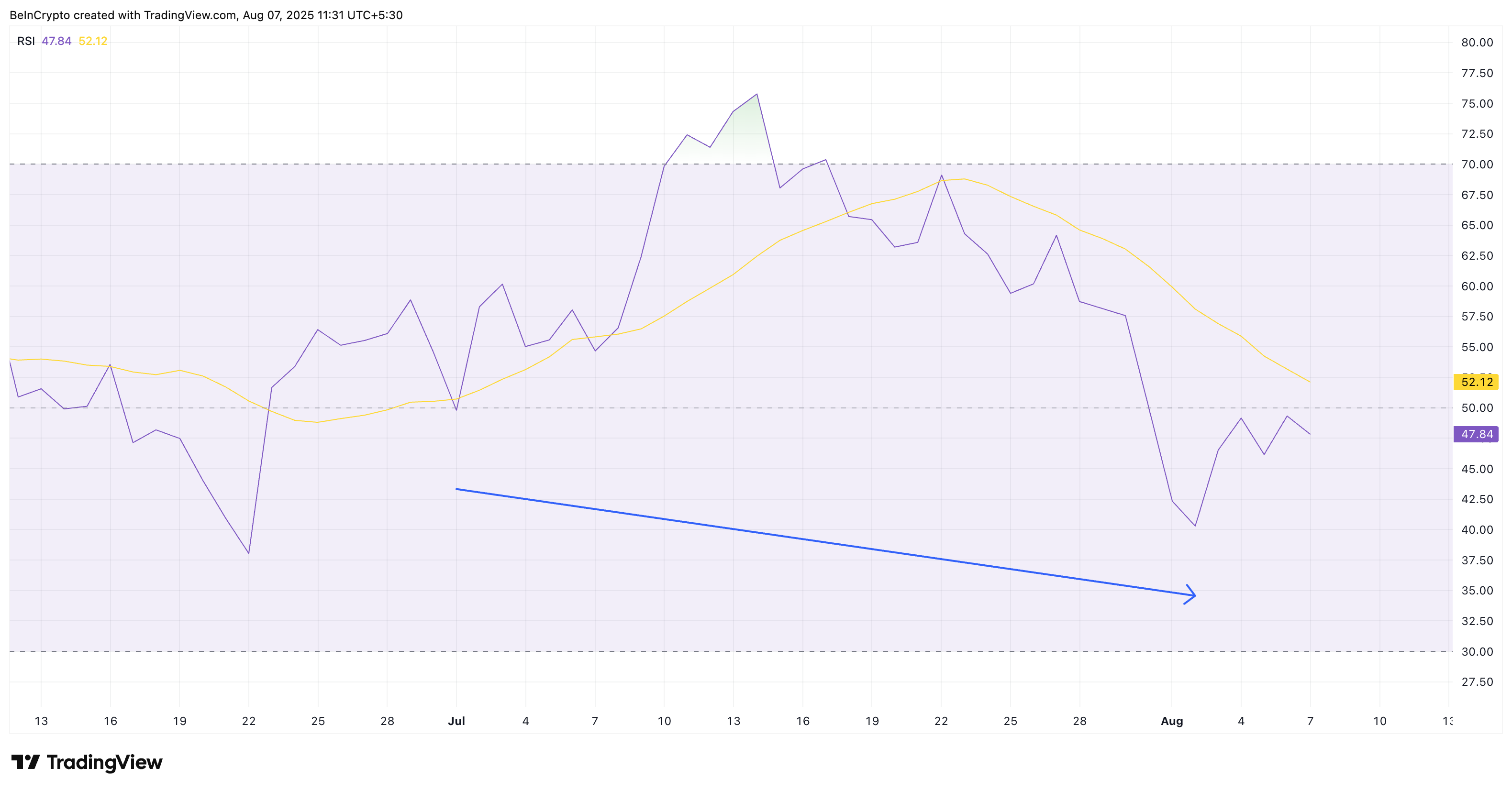 2 जुलाई से 2 अगस्त के बीच, Bitcoin ने एक उच्च लो बनाया, जो दर्शाता है कि प्रत्येक बाद की गिरावट पहले की तुलना में कम गहरी थी — यह प्राइस में मजबूती का एक क्लासिक संकेत है। हालांकि, इसी अवधि के दौरान, RSI ने एक लोअर लो मारा। इसे हिडन बुलिश डाइवर्जेंस कहा जाता है, जो इंगित करता है कि मोमेंटम चुपचाप बन रहा है, भले ही प्राइस अभी तक महत्वपूर्ण रूप से नहीं बढ़ी हो।