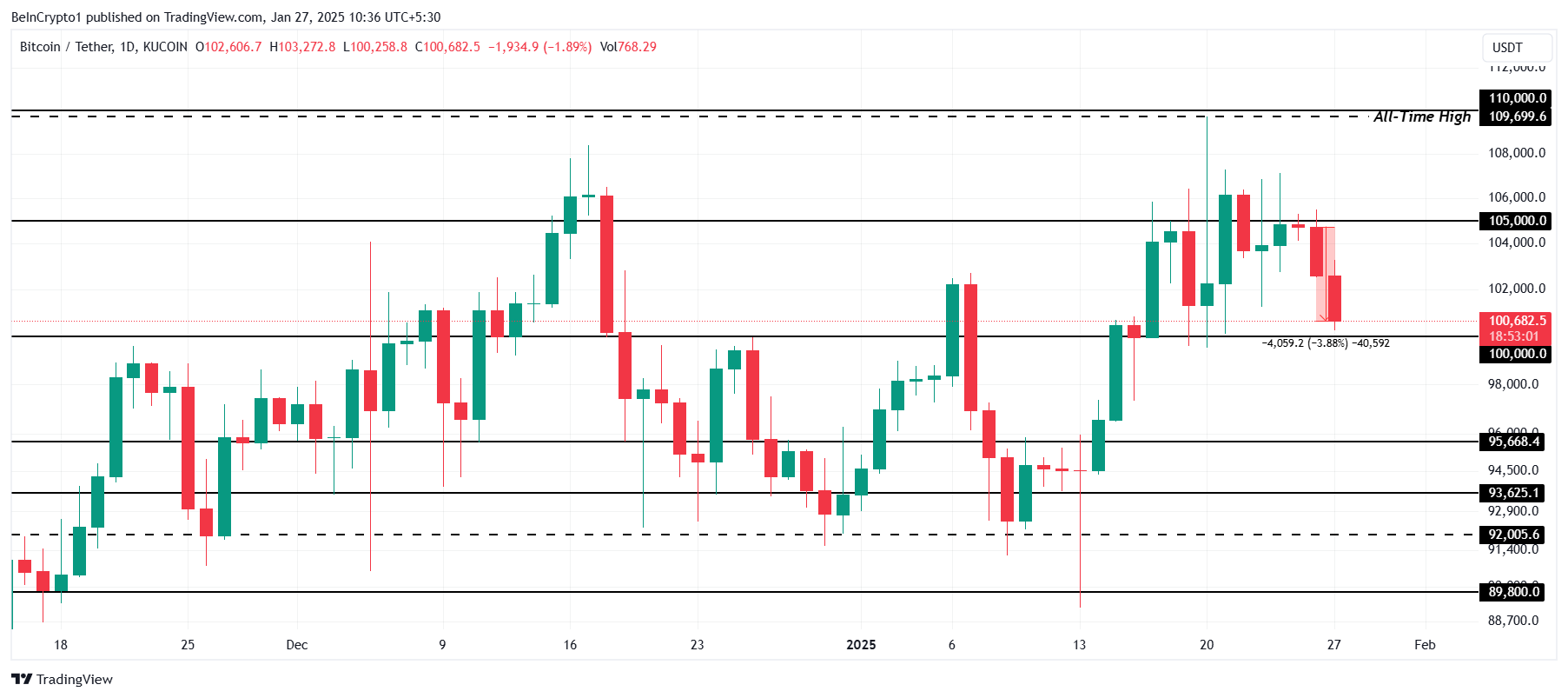 Bitcoin की कीमत पिछले 24 घंटों में 3.88% गिर गई है, जिससे यह $100,682 पर आ गई है। यह गिरावट मुख्य रूप से LTH लिक्विडेशन्स और BTC की $105,000 के रेजिस्टेंस लेवल के ऊपर बंद होने में असमर्थता के कारण हुई, जिससे शॉर्ट-टर्म में bearish भावना को बल मिला।