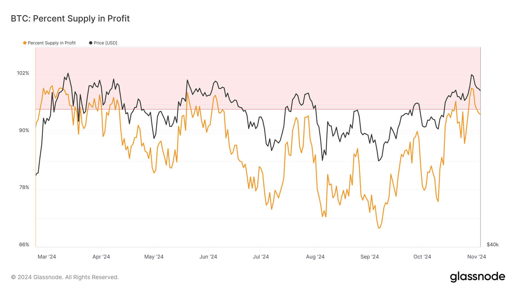 Bitcoin की मैक्रो मोमेंटम आशाजनक बनी हुई है, क्योंकि BTC की कुल सप्लाई जो लाभ में है, वह अक्सर बाजार के शीर्ष का संकेत देने वाले महत्वपूर्ण 95% थ्रेशोल्ड से नीचे है। जब यह स्तर पहुंचता है, यह आमतौर पर कीमतों में चरम सीमा को चिह्नित करता है और एक संभावित कीमत परिवर्तन का संकेत दे सकता है। वर्तमान में, Bitcoin के पास इस थ्रेशोल्ड तक पहुंचने से पहले अपनी ऊपरी गति जारी रखने की जगह है, जिसका अर्थ है कि संपत्ति और अधिक लाभ देख सकती है।