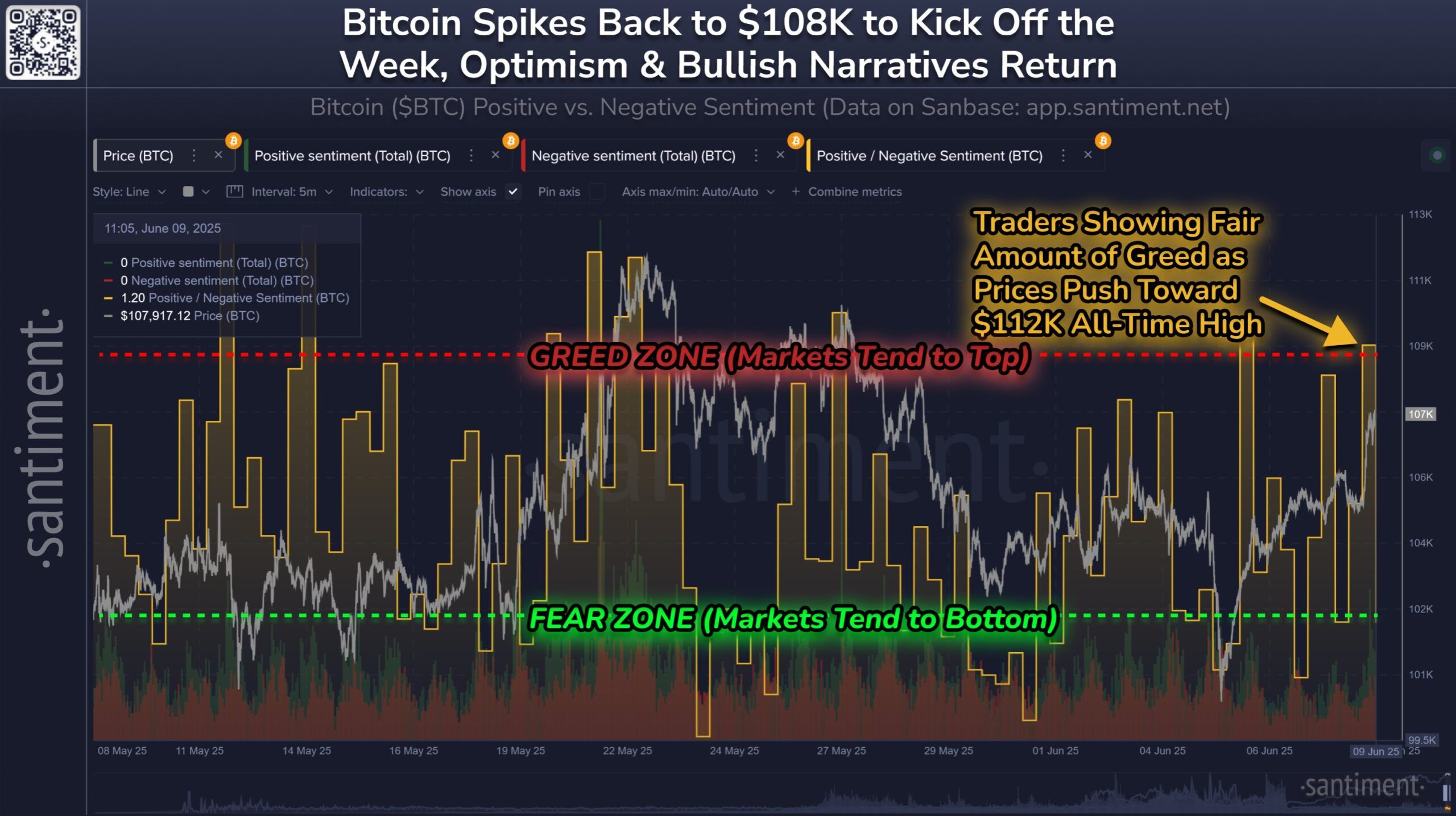 Bitcoin की कीमत वर्तमान में $109,480 पर है, जो महत्वपूर्ण $110,000 प्रतिरोध से थोड़ा नीचे है। हालांकि BTC ने पिछले 24 घंटों में इस प्रतिरोध को संक्षेप में पार किया, व्यापक बाजार संकेत संभावित कीमत गिरावट का सुझाव देते हैं। बढ़ती ट्रेडर भावना और आसन्न CPI रिपोर्ट के साथ, Bitcoin को अपने वर्तमान स्तर को बनाए रखने में संघर्ष करना पड़ सकता है।