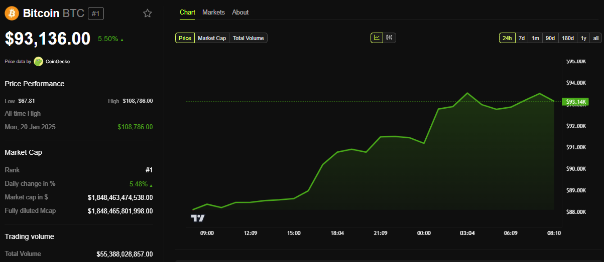 तत्काल परिणामस्वरूप, Bitcoin ने $93,000 की सीमा को पार कर लिया। इस लेखन के समय, BTC $93,136 पर ट्रेड कर रहा था, जो पिछले 24 घंटों में लगभग 6% की वृद्धि का प्रतिनिधित्व करता है।