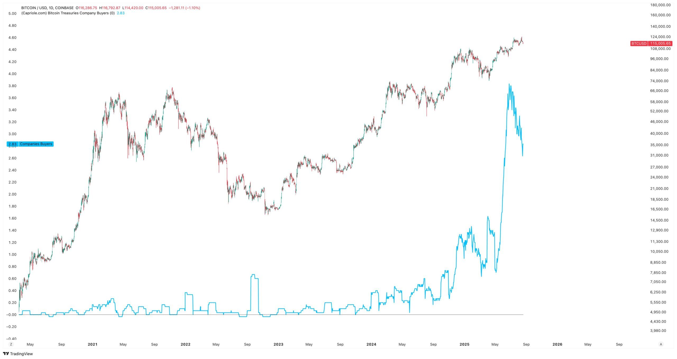 कंपनियों की संख्या जो अपने ट्रेजरी के लिए Bitcoin खरीद रही हैं, हाल ही में रिकॉर्ड-सेटिंग प्राइस प्रदर्शन के बावजूद, प्रति दिन केवल 2.8 तक गिर गई है।