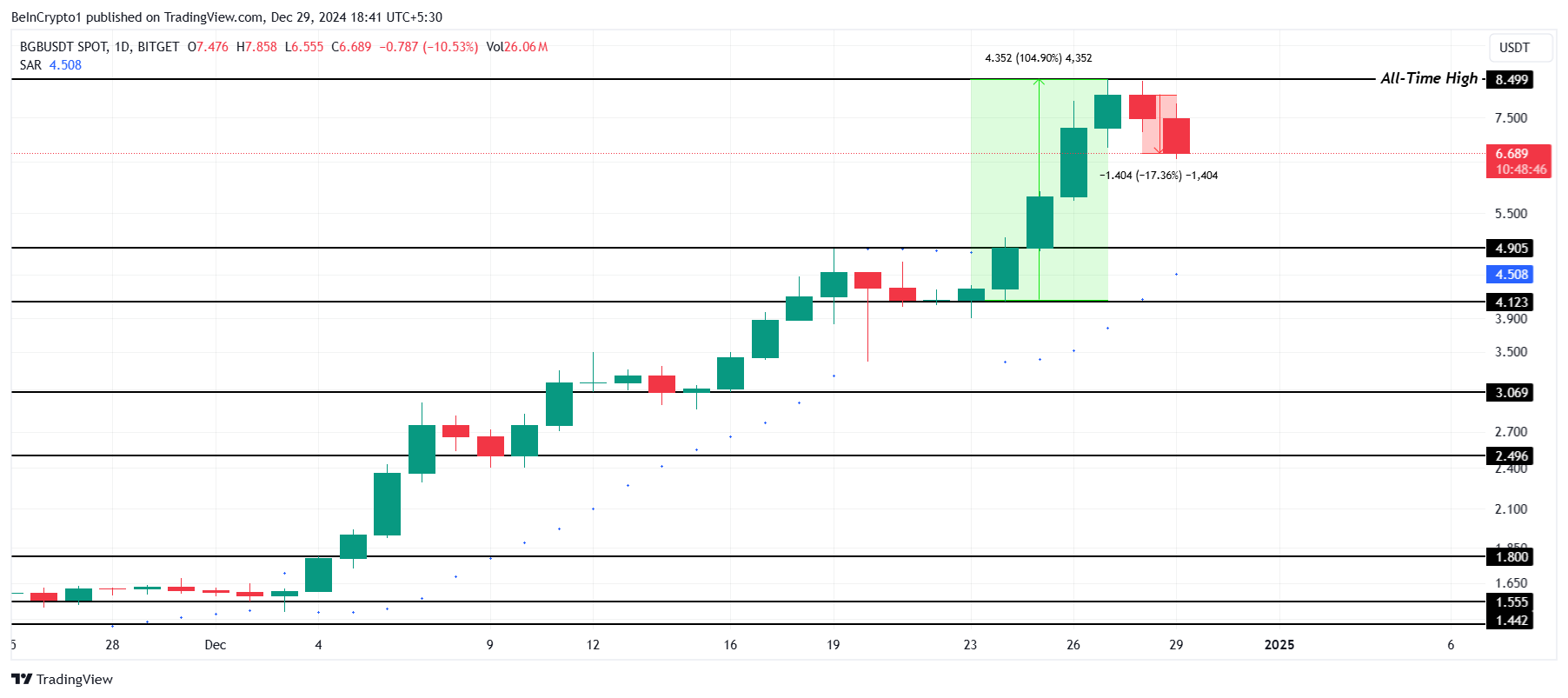 हालांकि, बुलिश व्यापक बाजार संकेतों द्वारा समर्थित एक मजबूत रिकवरी BGB को इसके वर्तमान ऑल-टाइम हाई $8.49 से आगे धकेल सकती है। एक नया उच्च स्तर प्राप्त करना मंदी के सिद्धांत को अमान्य कर देगा और टोकन के लिए नए सिरे से गति का संकेत देगा, जिससे बाजार में इसकी स्थिति एक उत्कृष्ट प्रदर्शनकर्ता के रूप में मजबूत होगी।