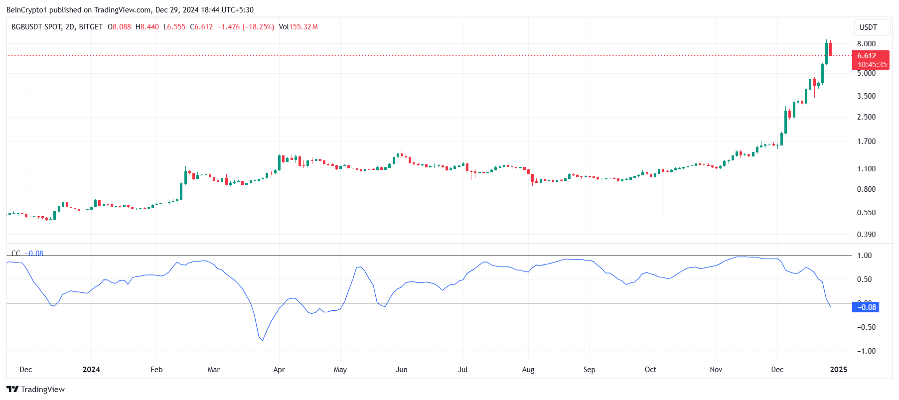 BGB का मैक्रो मोमेंटम इसकी बिटकॉइन के साथ नकारात्मक सहसंबंध से प्रभावित हो रहा है, जो वर्तमान में -0.16 पर है। इस विपरीत संबंध का मतलब है कि BGB की प्राइस trajectory बिटकॉइन के विपरीत दिशा में जा रही है, जो चिंताजनक हो सकता है अगर BTC की कीमत और बढ़ती है।