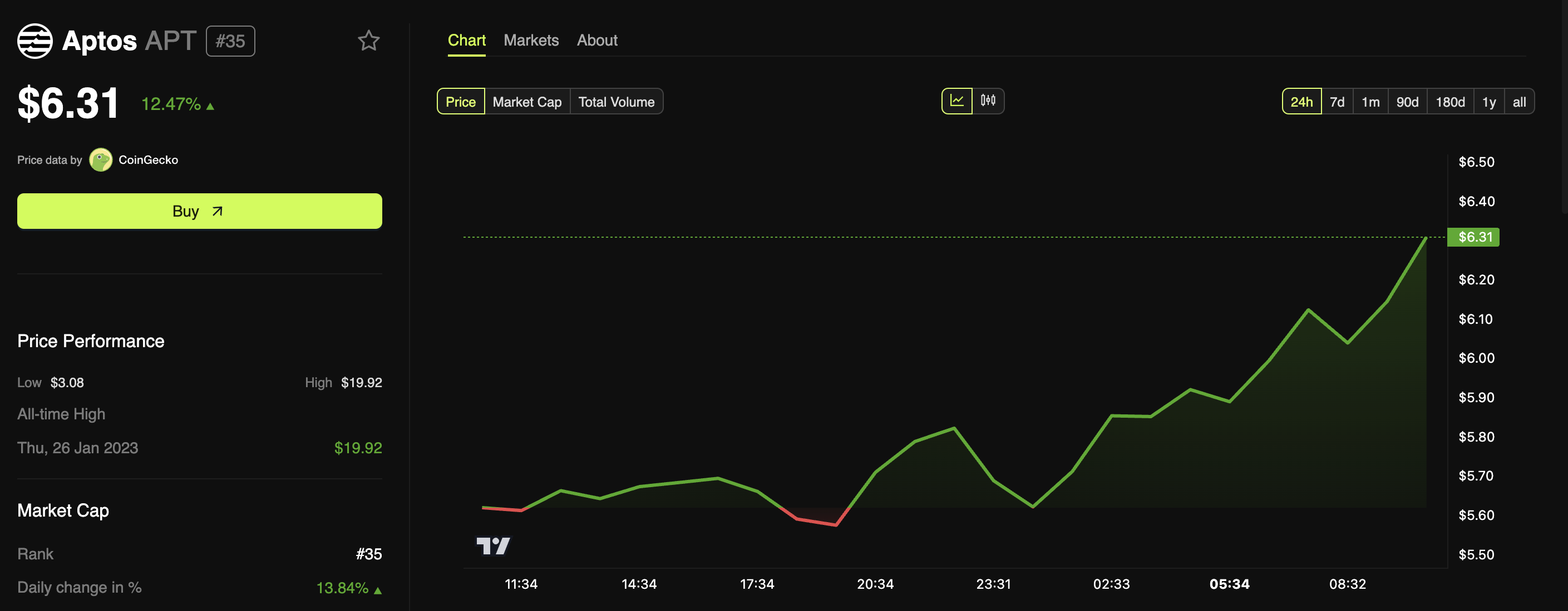 यह क्रिप्टोकरेन्सी, जो वर्तमान में मार्केट कैप के अनुसार 36वें स्थान पर है, प्रेस समय पर $6.31 पर ट्रेड कर रही थी। इसका ट्रेडिंग वॉल्यूम भी महत्वपूर्ण रूप से बढ़ा, 14.15% बढ़कर $336.42 मिलियन हो गया।