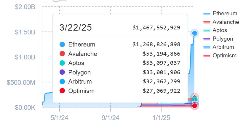 अन्य चेन, जैसे Avalanche और Aptos, प्रत्येक में फंड की सप्लाई का लगभग $56 मिलियन, या लगभग 3.6% है। Ethereum Layer-2 नेटवर्क जैसे Polygon, Arbitrum, और Optimism बाकी को होस्ट करते हैं।